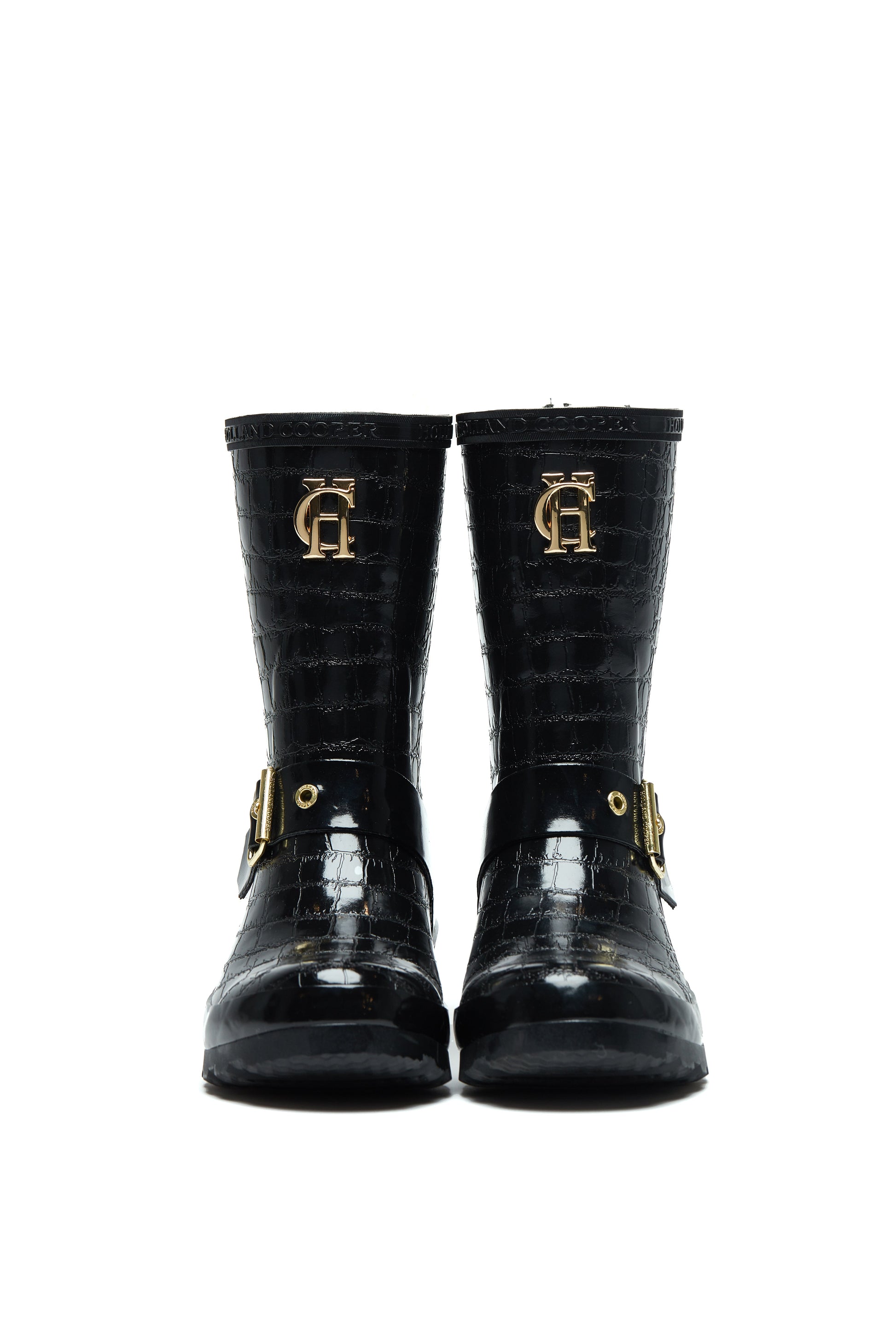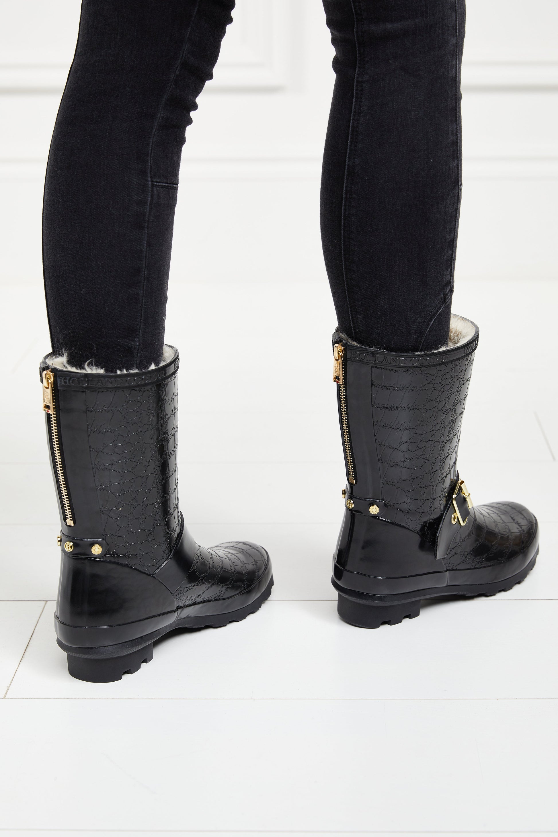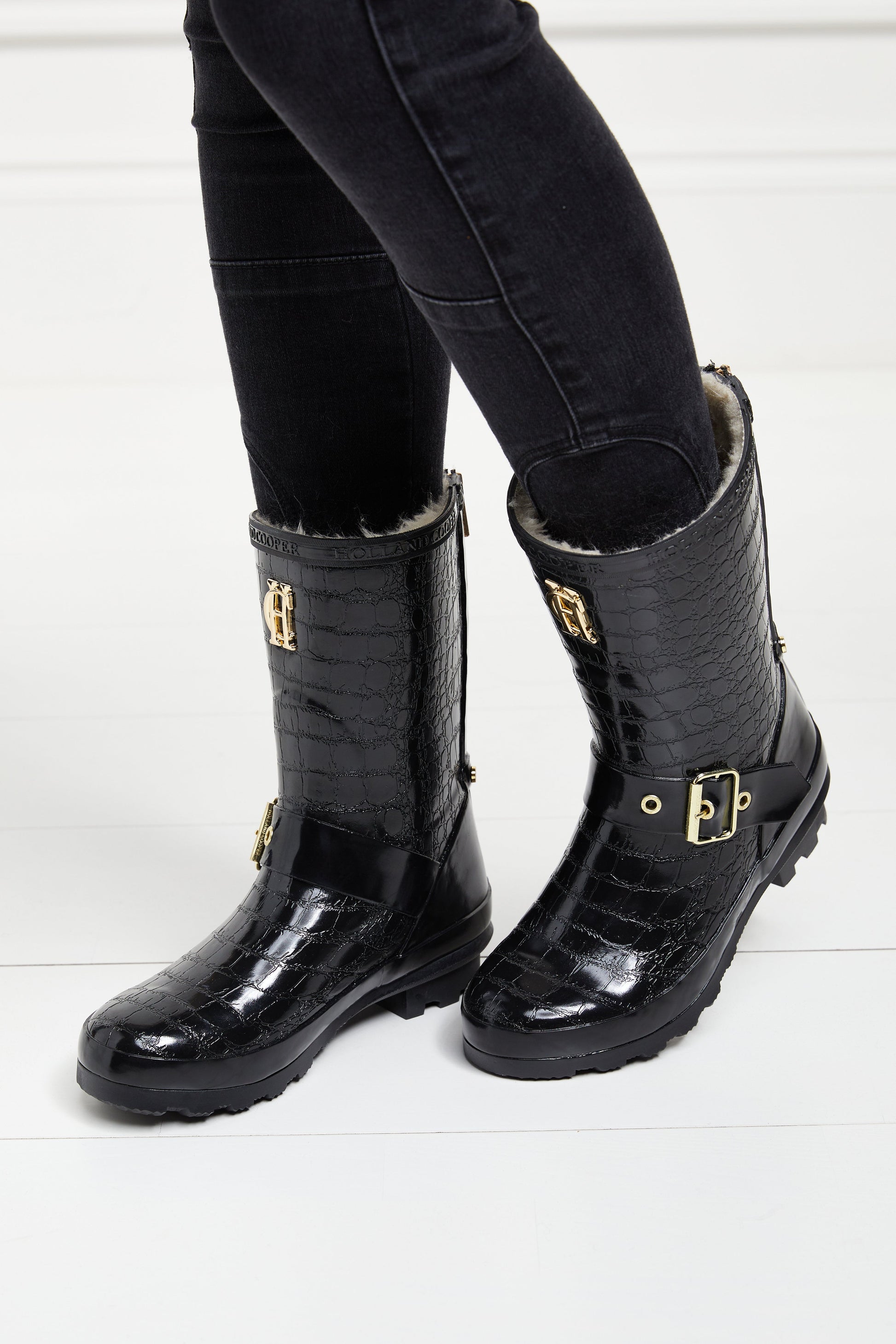 Handcrafted from a superior vulcanised rubber. our Sherpa Lined Chelsea Wellington Boots are 100% waterproof - perfect for keeping your feet dry and stylish this season. The cropped boot features a traction grip sole that provides stability on all terrains. whilst the quick dry fabric adds to both their luxury look and practicality. This eye-catching boot is adorned with iconic HC hardware. strapping details and a gold zip running down the back of wellington.