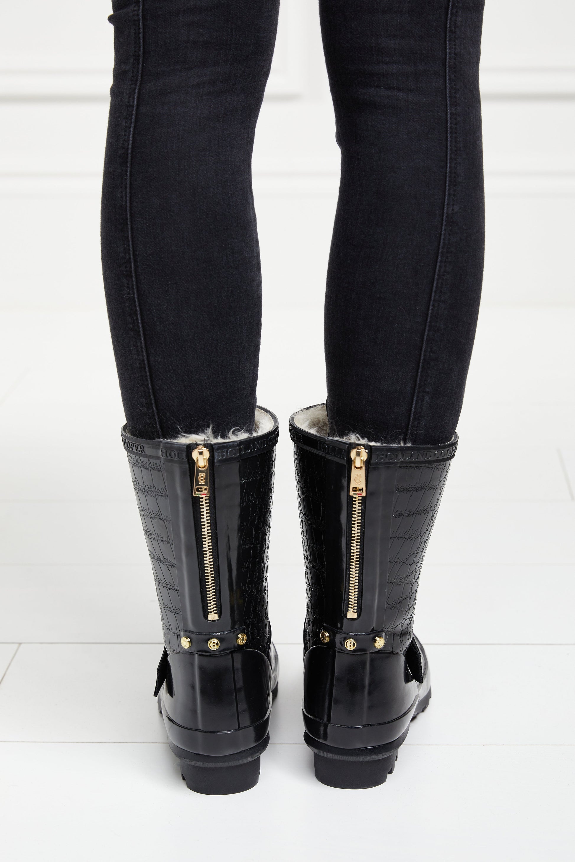 - Gold metal zip running down the back of the wellington