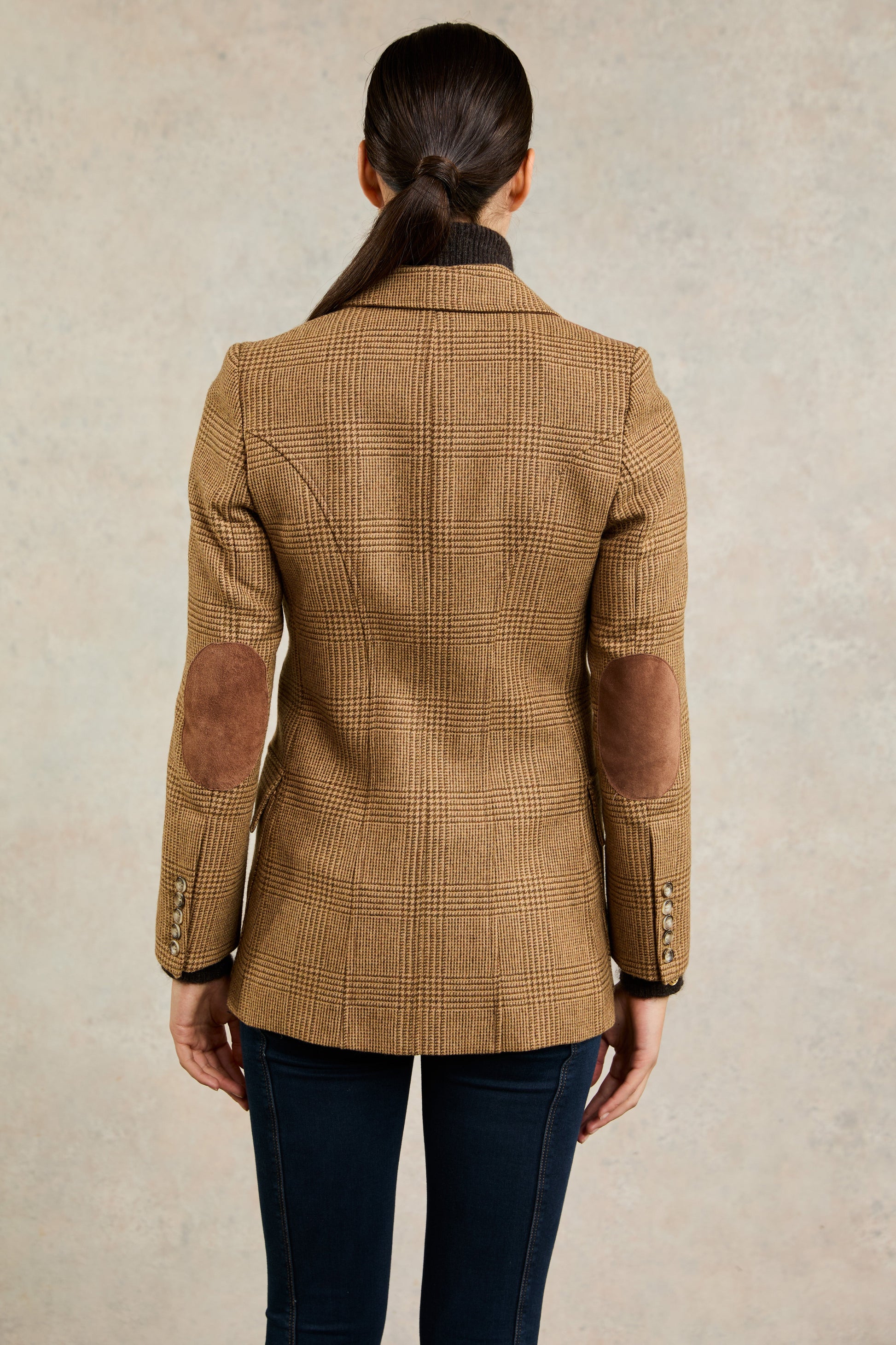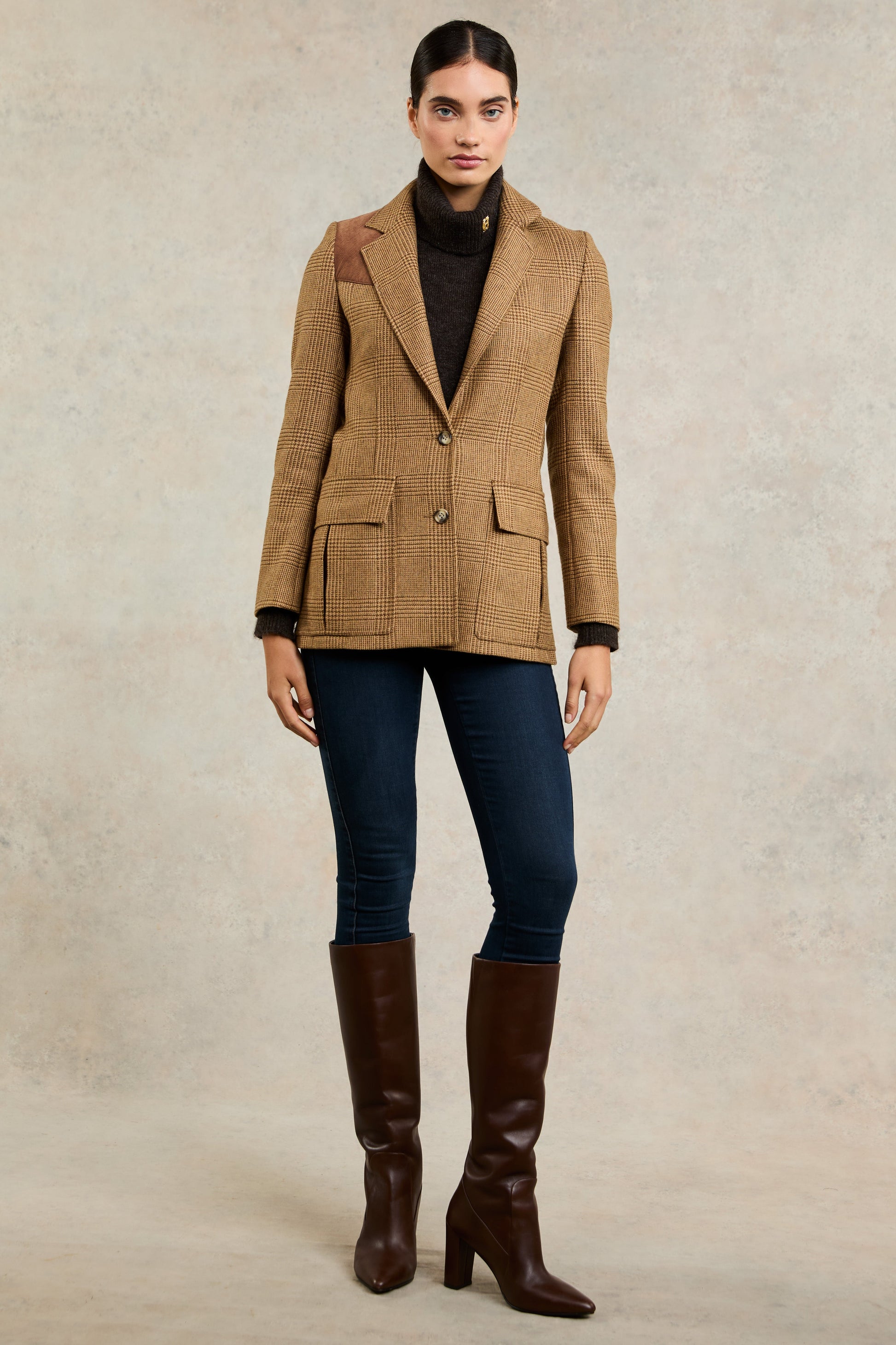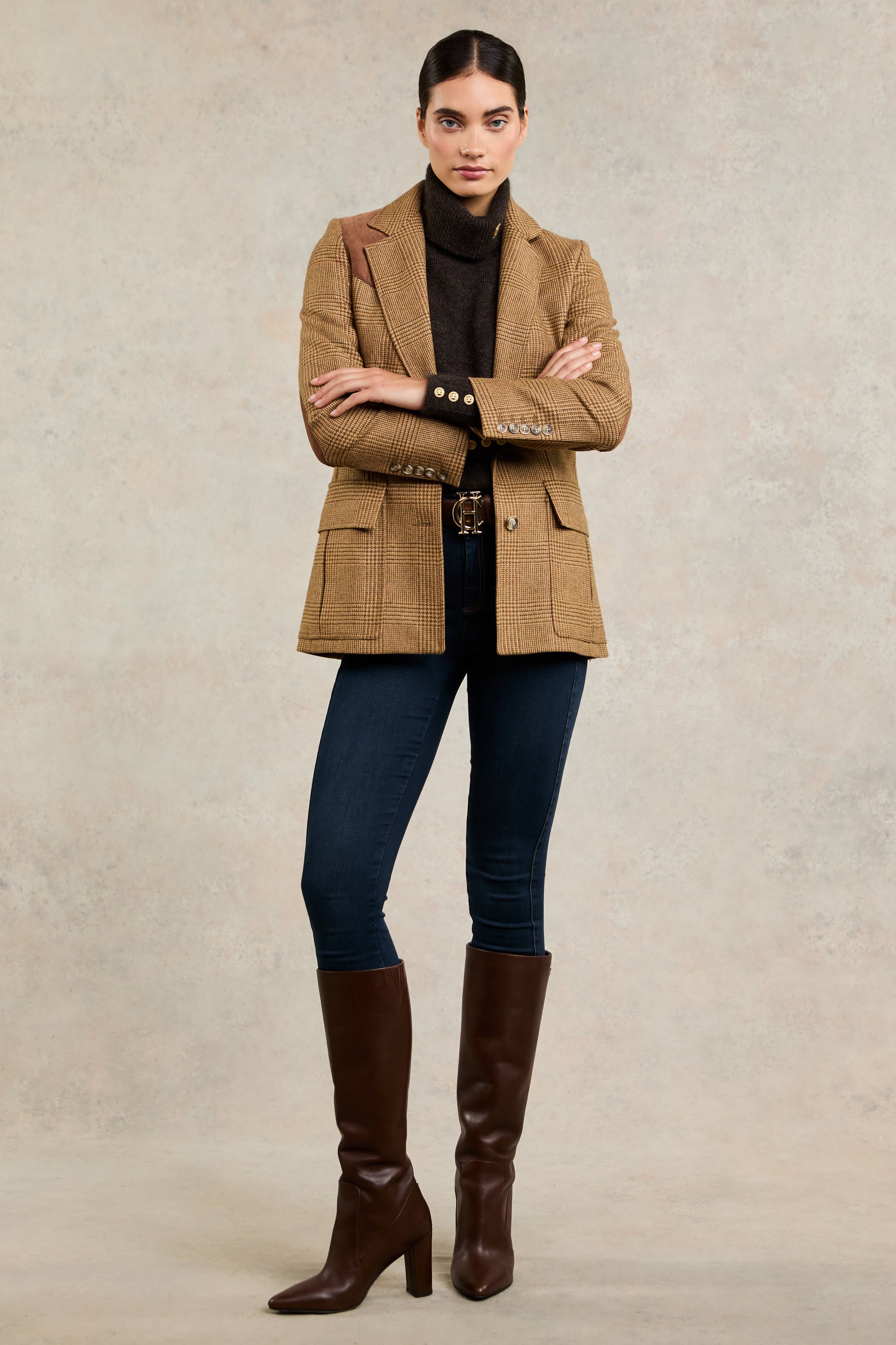 This is a modern and elegant version of a traditional country-style blazer. Made from durable. British-made wools and trimmed with authentic suede. Complete with stretch lining for extra movement. single back vent. storm collar tab and trimmed with branded HC faux horn buttons. Wear it solo or layered over one of our shirts or signature pieces of knitwear. This product has been hand cut and made entirely in the UK.