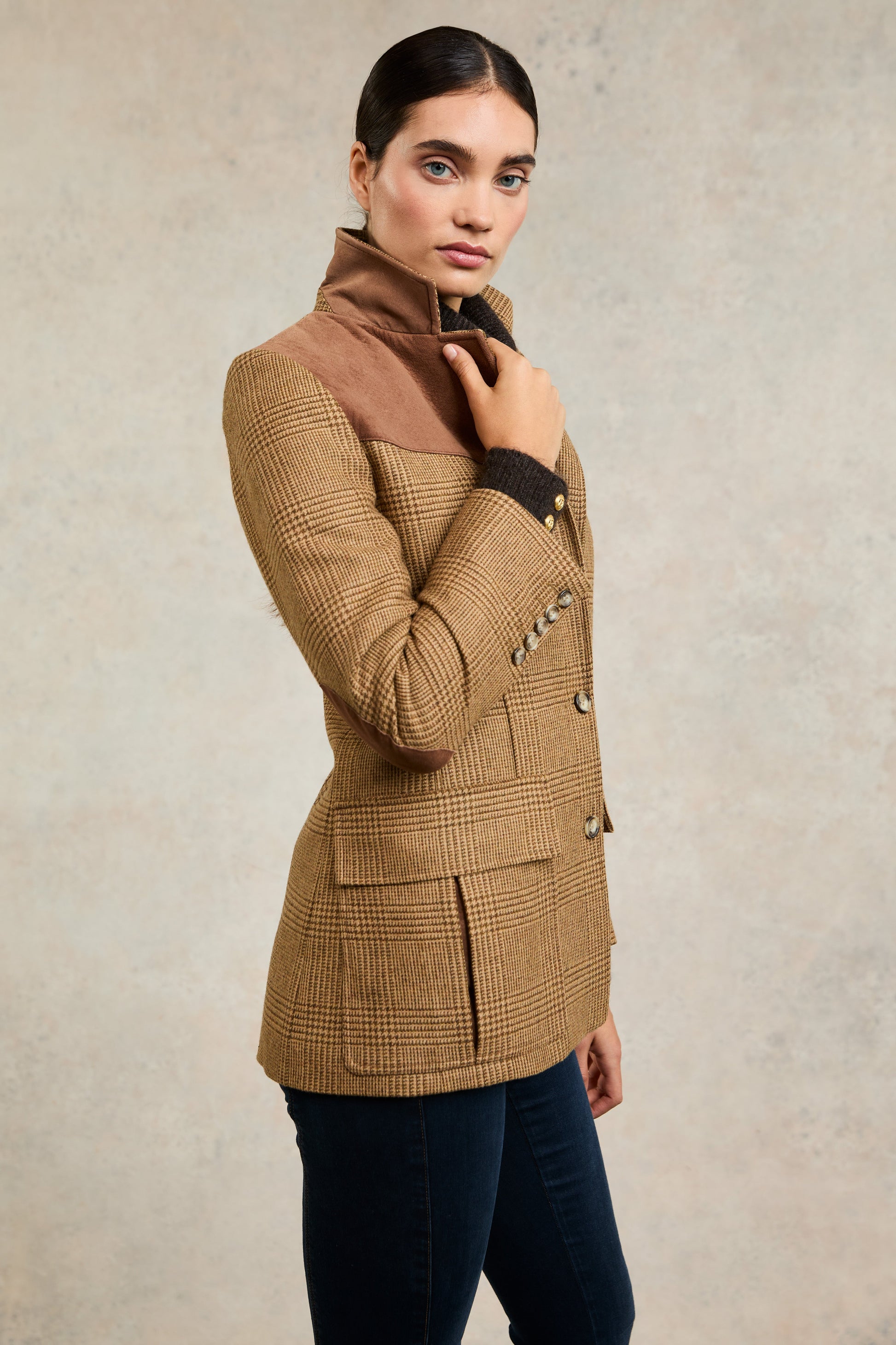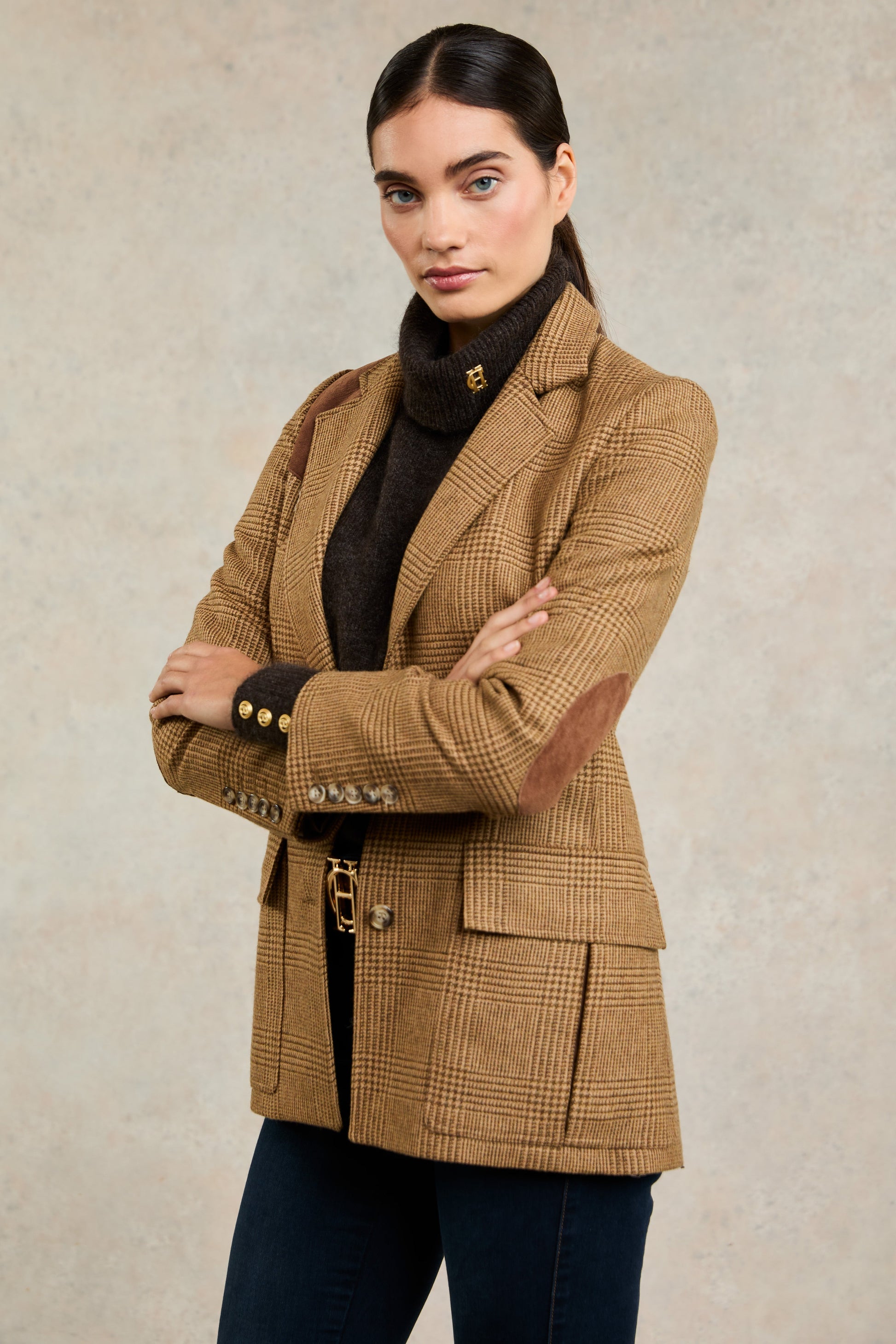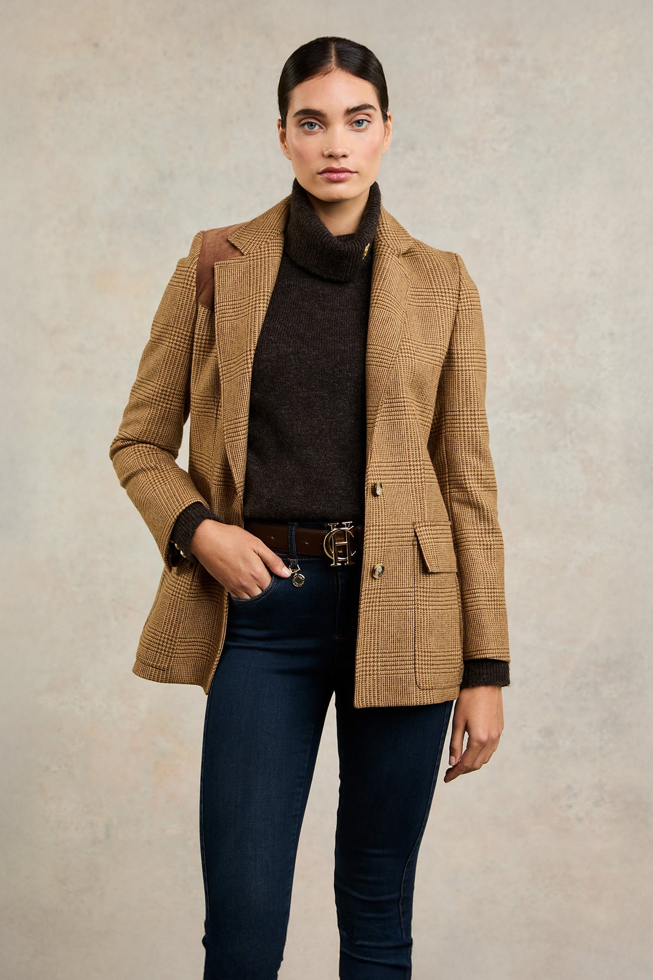 This is a modern and elegant version of a traditional country-style blazer. Made from durable. British-made wools and trimmed with authentic suede. Complete with stretch lining for extra movement. single back vent. storm collar tab and trimmed with branded HC faux horn buttons. Wear it solo or layered over one of our shirts or signature pieces of knitwear. This product has been hand cut and made entirely in the UK.