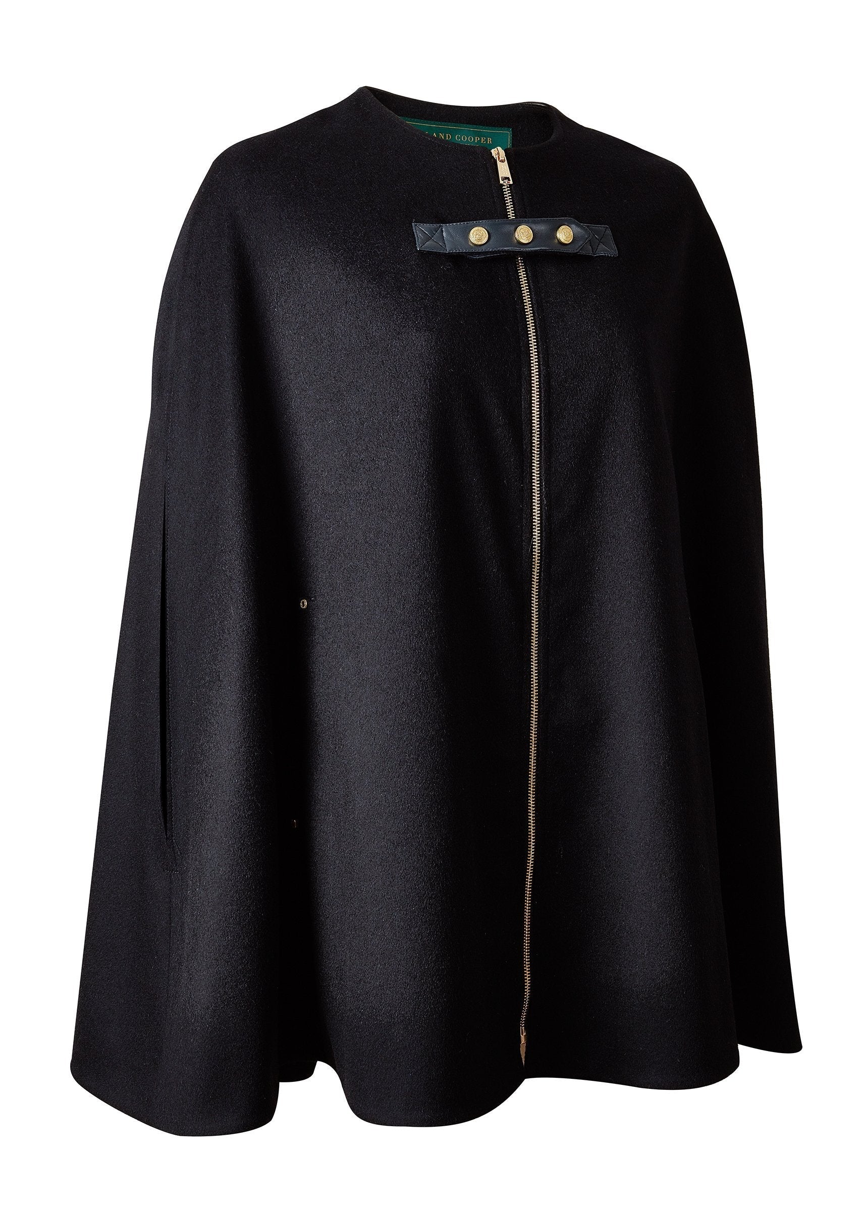 This elegant cape is made from British wools and trimmed with authentic leather. The close fit across the shoulders ensures comfort and ease of movement. This product has been hand cut and made in England.