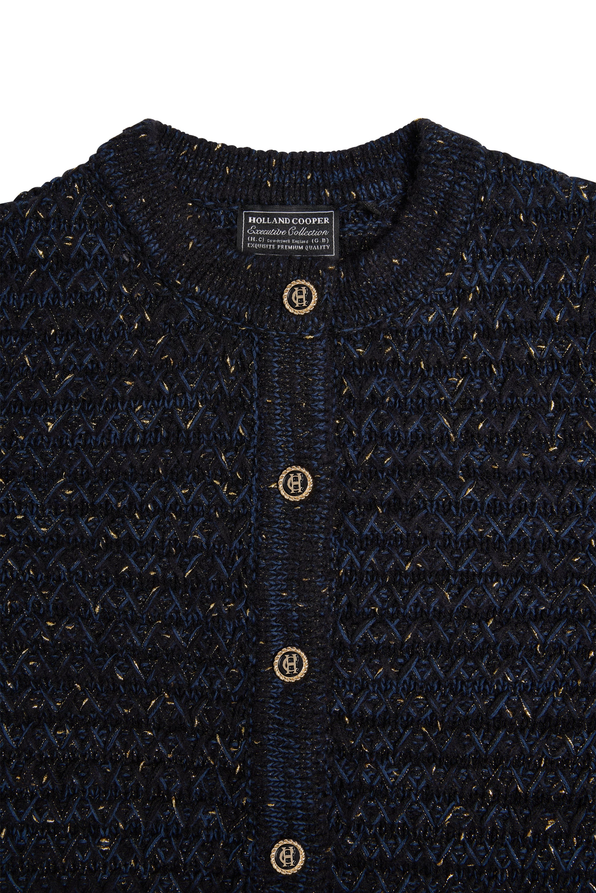 The Sofia Knitted Jacket combines casual elegance with refined detailing. Crafted from a textured knit with subtle metallic yarn. it offers a relaxed fit and set-in sleeves for effortless layering. Finished with a signature HC charm on the welt pocket and enamel buttons. this versatile piece brings a touch of luxury to everyday wear.