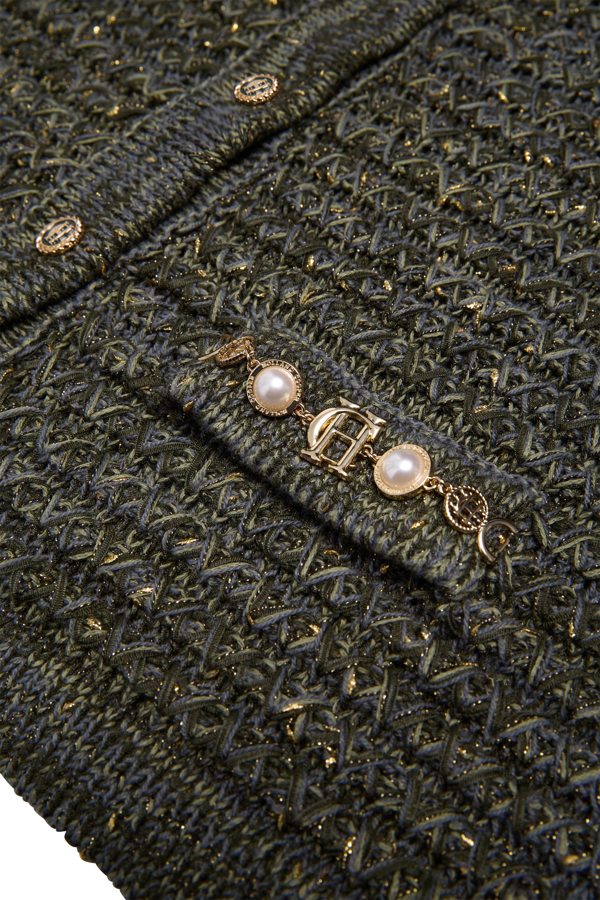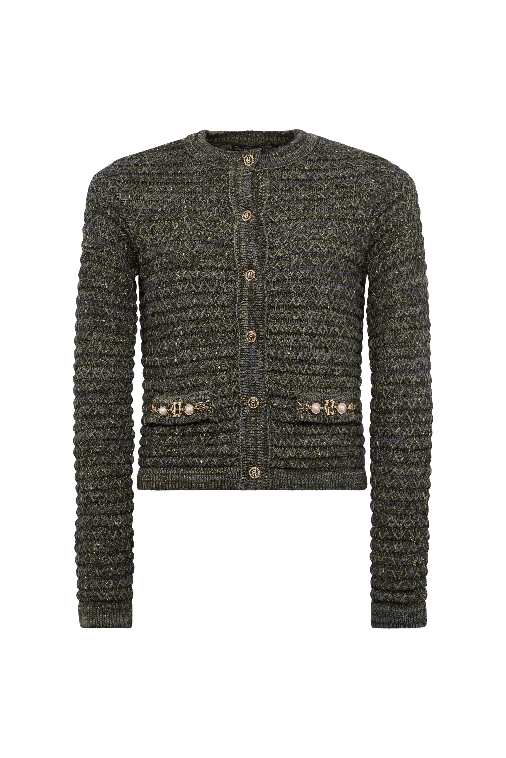 The Sofia Knitted Jacket combines casual elegance with refined detailing. Crafted from a textured knit with subtle metallic yarn. it offers a relaxed fit and set-in sleeves for effortless layering. Finished with a signature HC charm on the welt pocket and enamel buttons. this versatile piece brings a touch of luxury to everyday wear.
