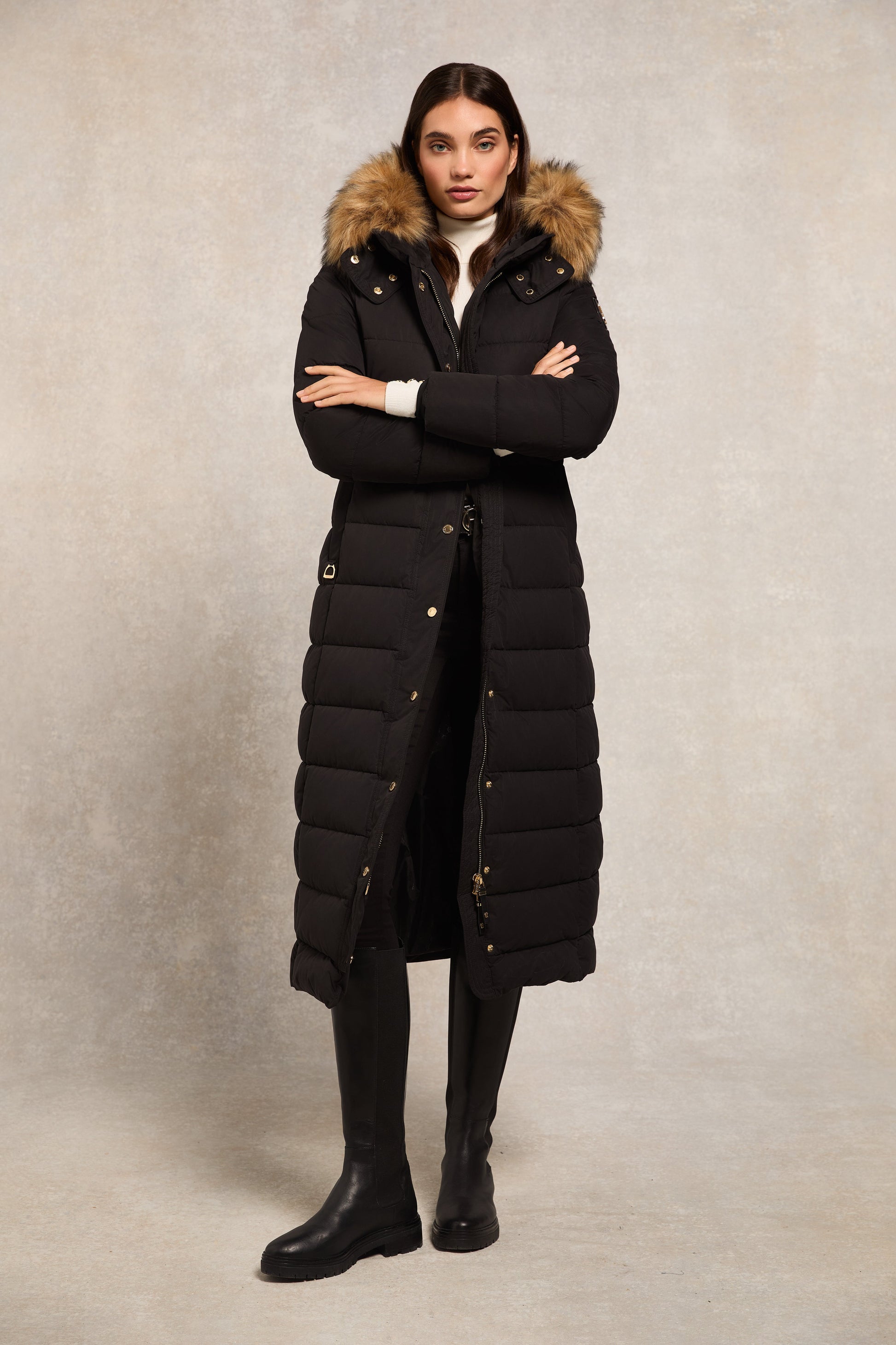 Designed with a longline silhouette and slim fit. the Stoneleigh Longline Coat has been meticulously crafted to ensure style. warmth and practicality. With a detachable faux fur hood collar. neoprene storm cuffs and eco-fill. this piece is ideal for chilly winter days whilst ensuring you still look put together. Finished with our iconic HC hardware and tonal embroidery.