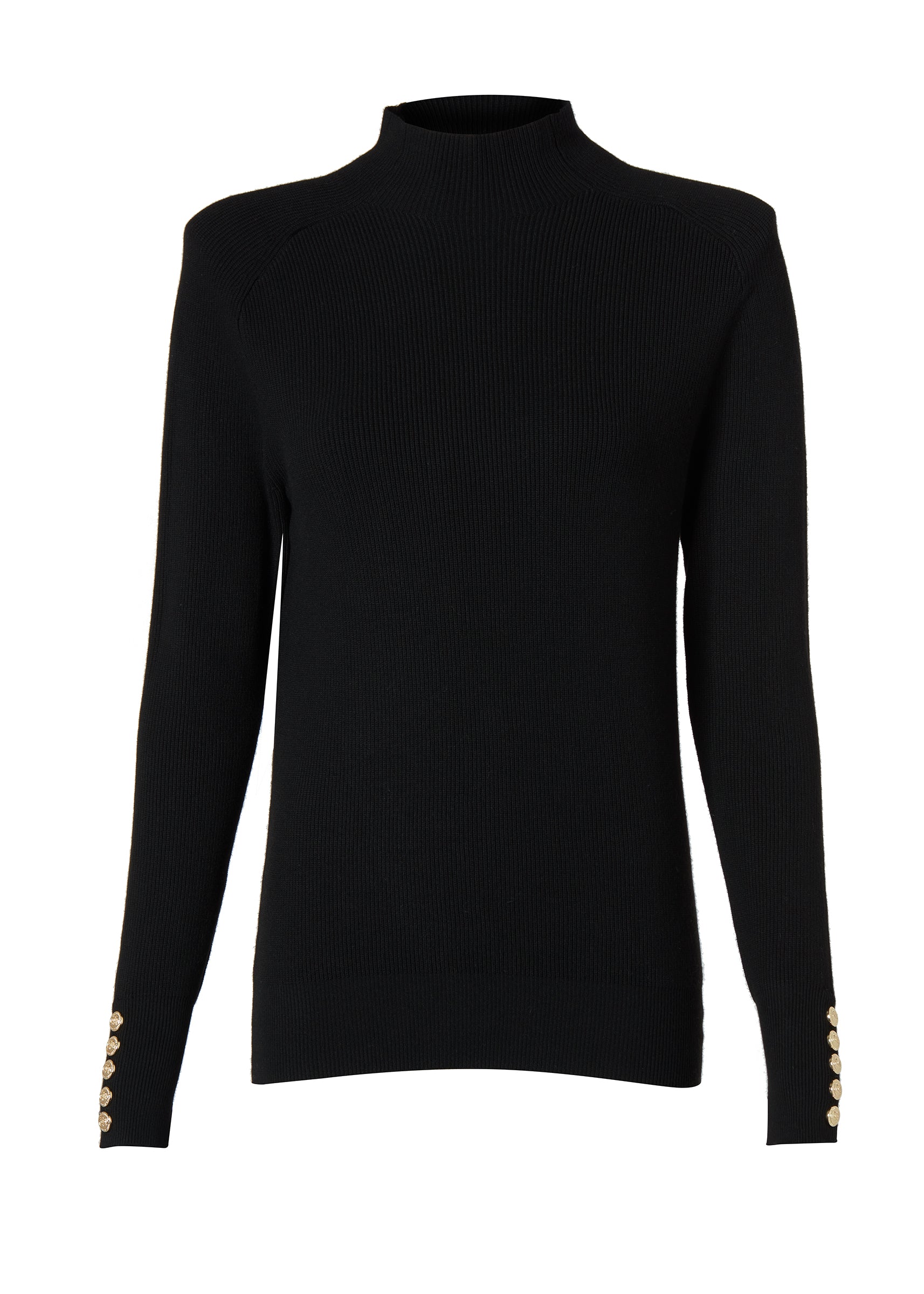 A classic and stylish addition to your wardrobe. This elegant knit features a high neckline and distinctive traveling ribs on the raglan sleeves. adding a unique texture and design. Gold rivets on the cuffs lend a touch of luxury. while the slim fit through the body creates a flattering silhouette. The Tara High Neck Knit is the perfect blend of chic design and refined details. making it an essential piece for any season.