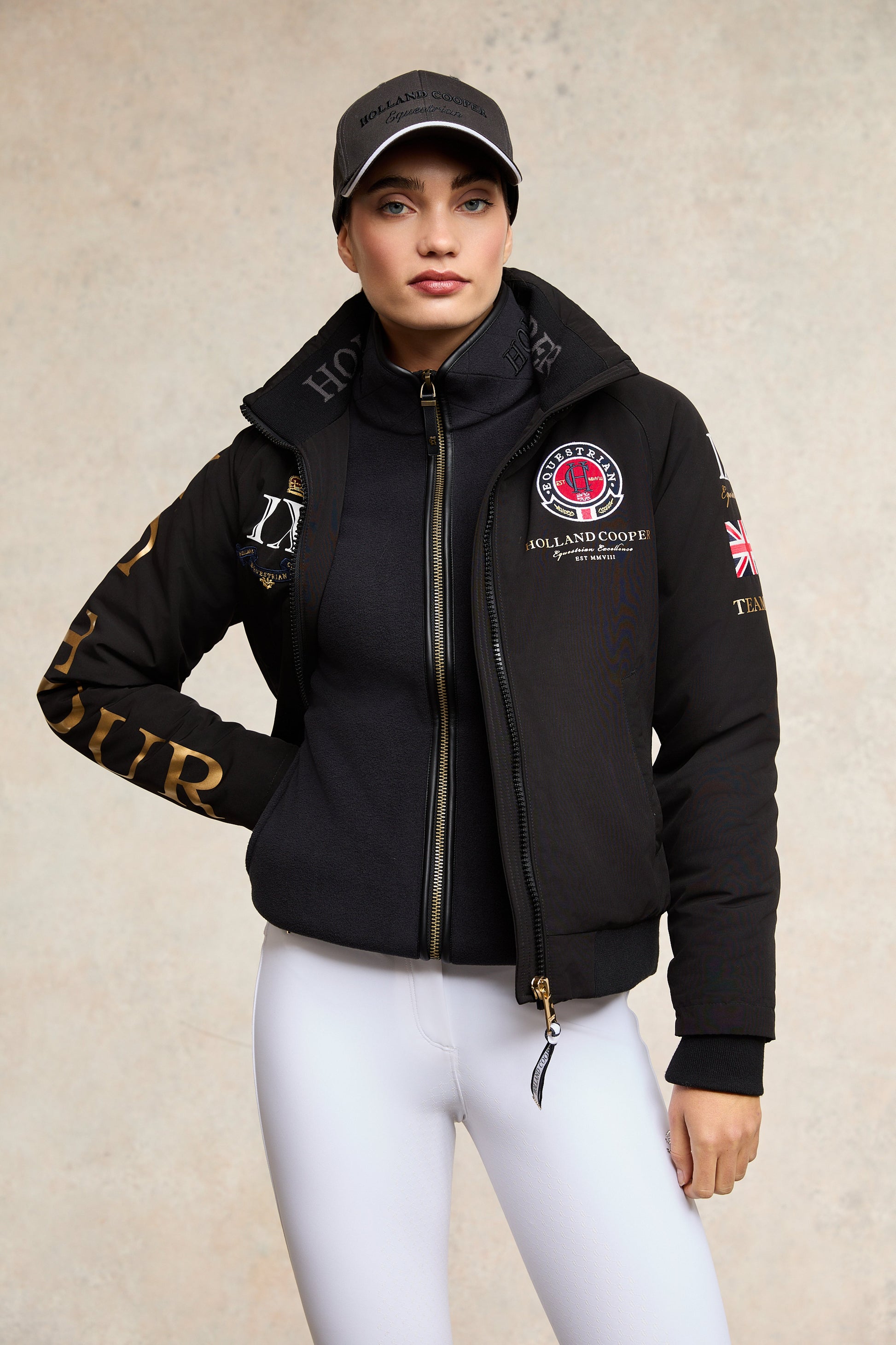 The Holland Cooper Team riding Jacket collection is a luxurious blend of sporting heritage and national pride. Composed of hard wearing. water-resistant shell fabric and lined with a soft polar fleece. this classic jacket transgresses many environmental boundaries and ensure comfort in or out of the saddle. Designed with a bold colour-block aesthetic and emblazoned with signature HC Equestrian graphics.