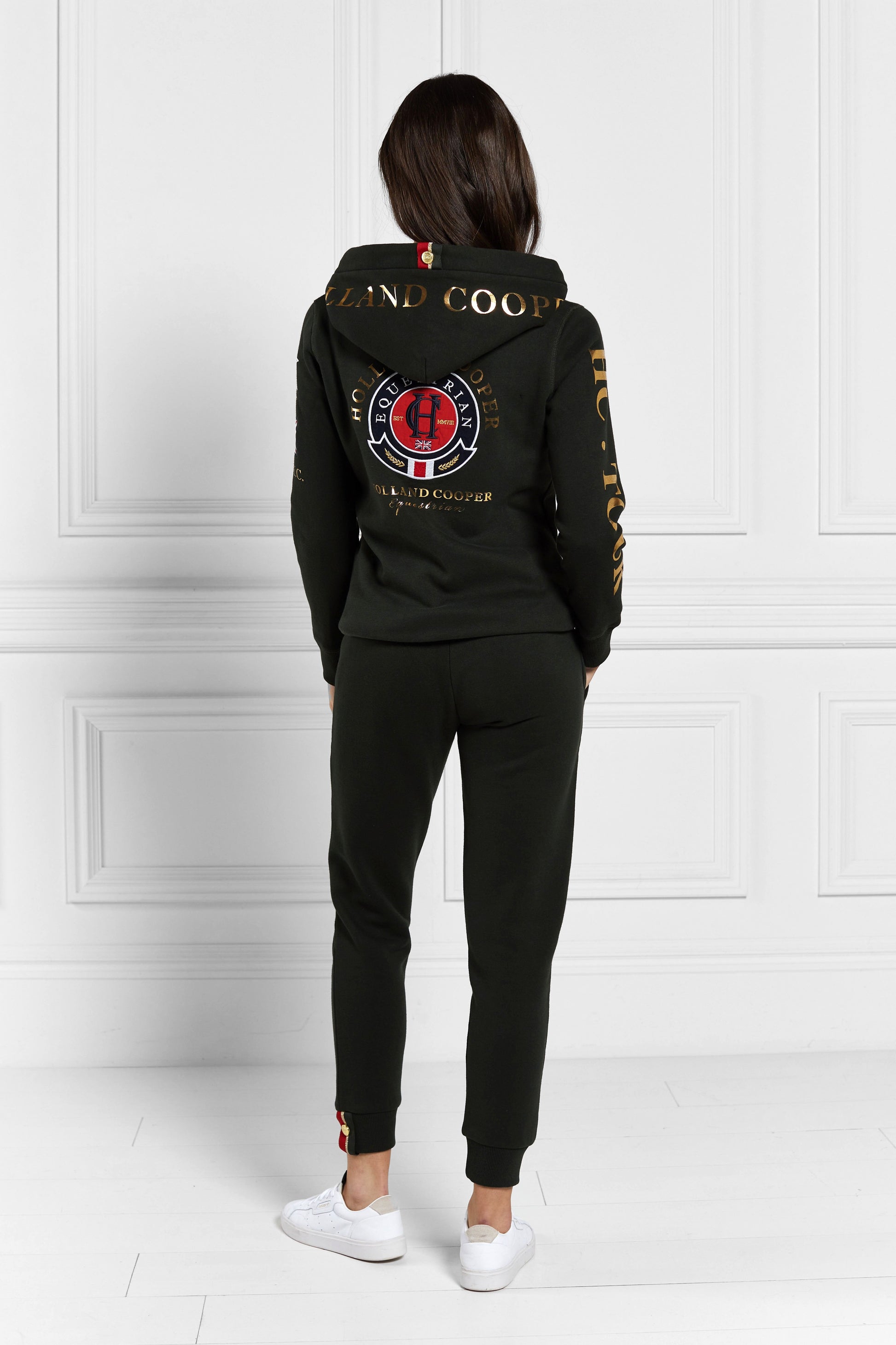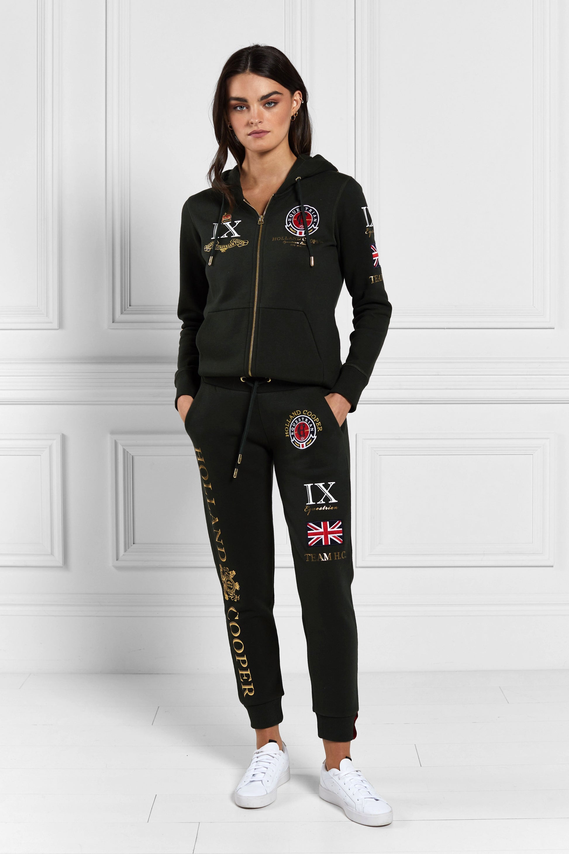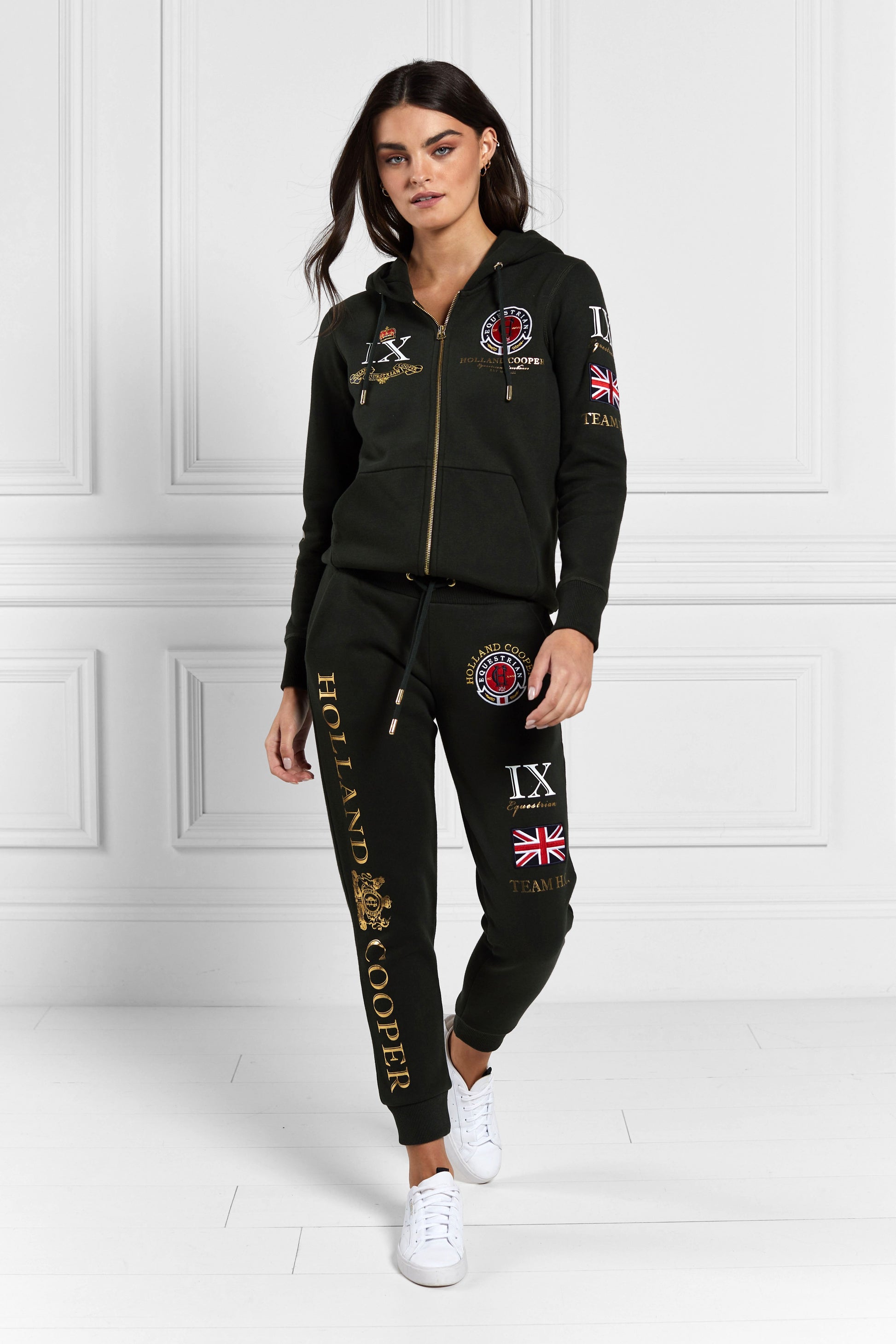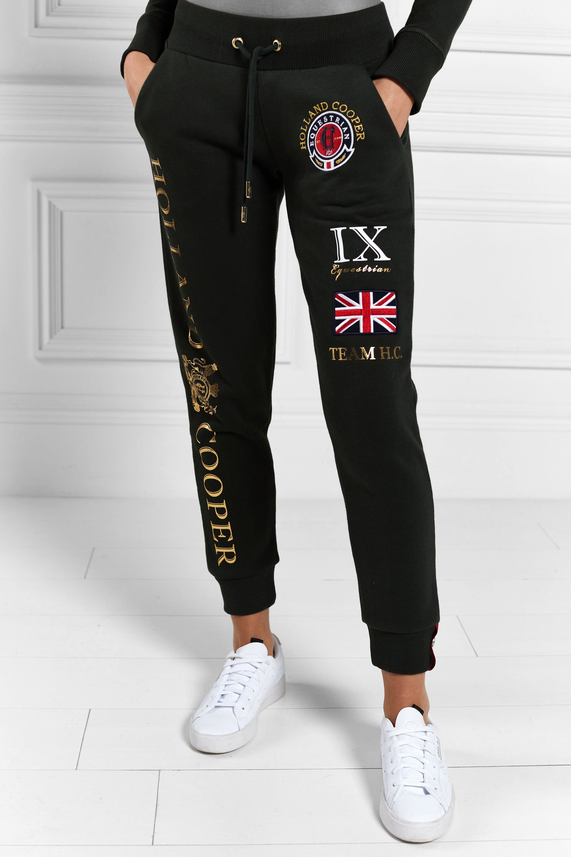 This comfortable classic is sure to become a style staple in your everyday casual wardrobe. The Holland Cooper Joggers are composed of luxury soft cotton. designed with a loose fit and elasticated waistband to flatter the female figure. Emblazoned with bold Holland Cooper graphics and distinguished embossed gold hardware. they are sure to compliment your individual sense of style.