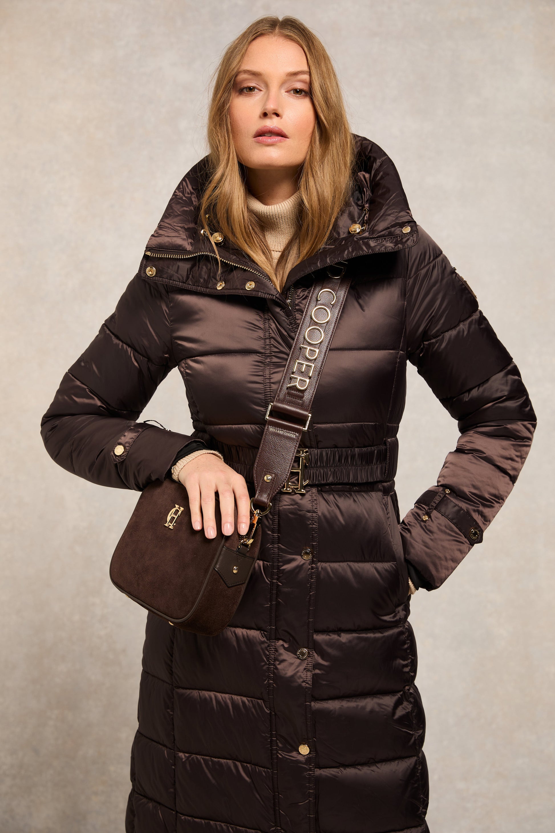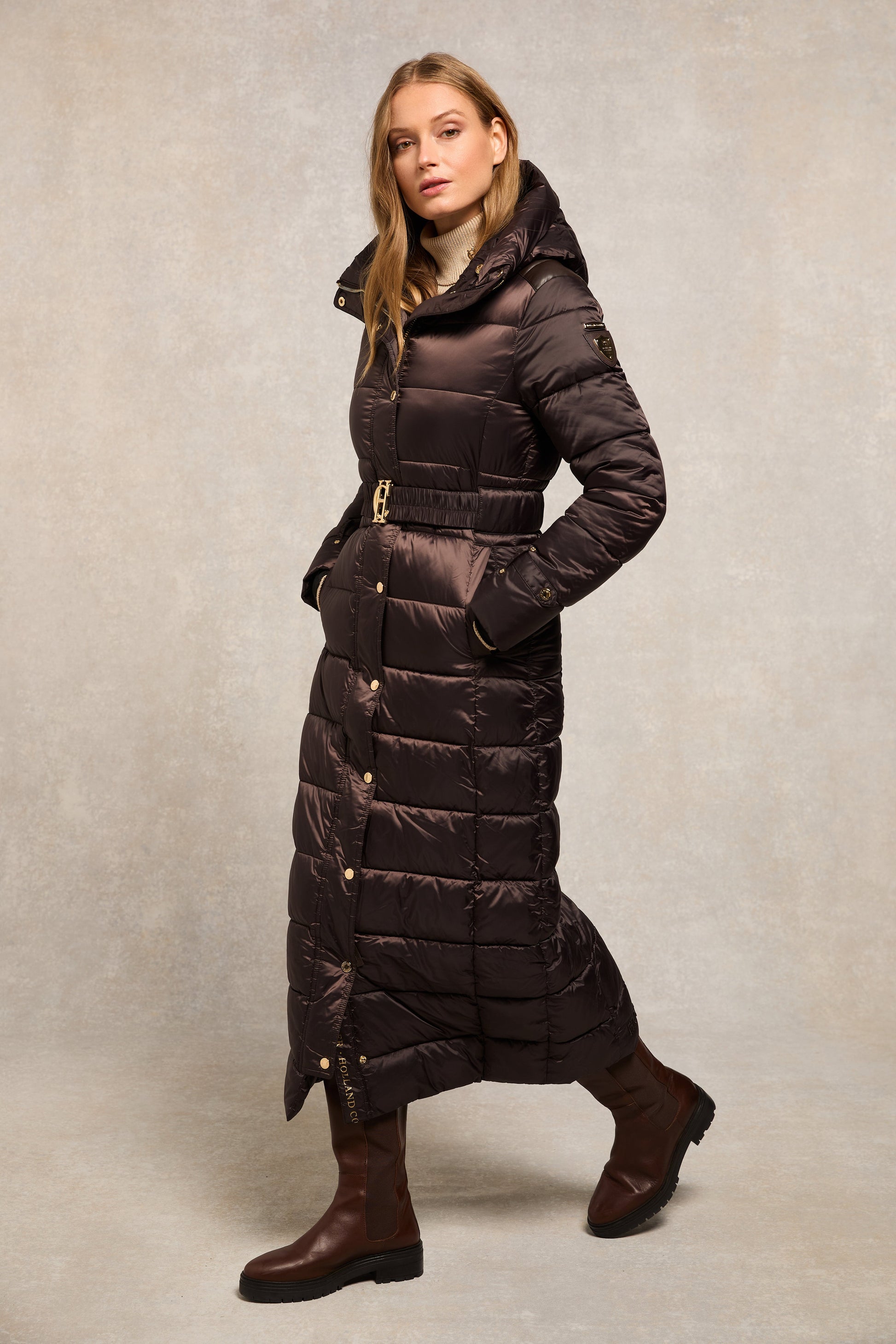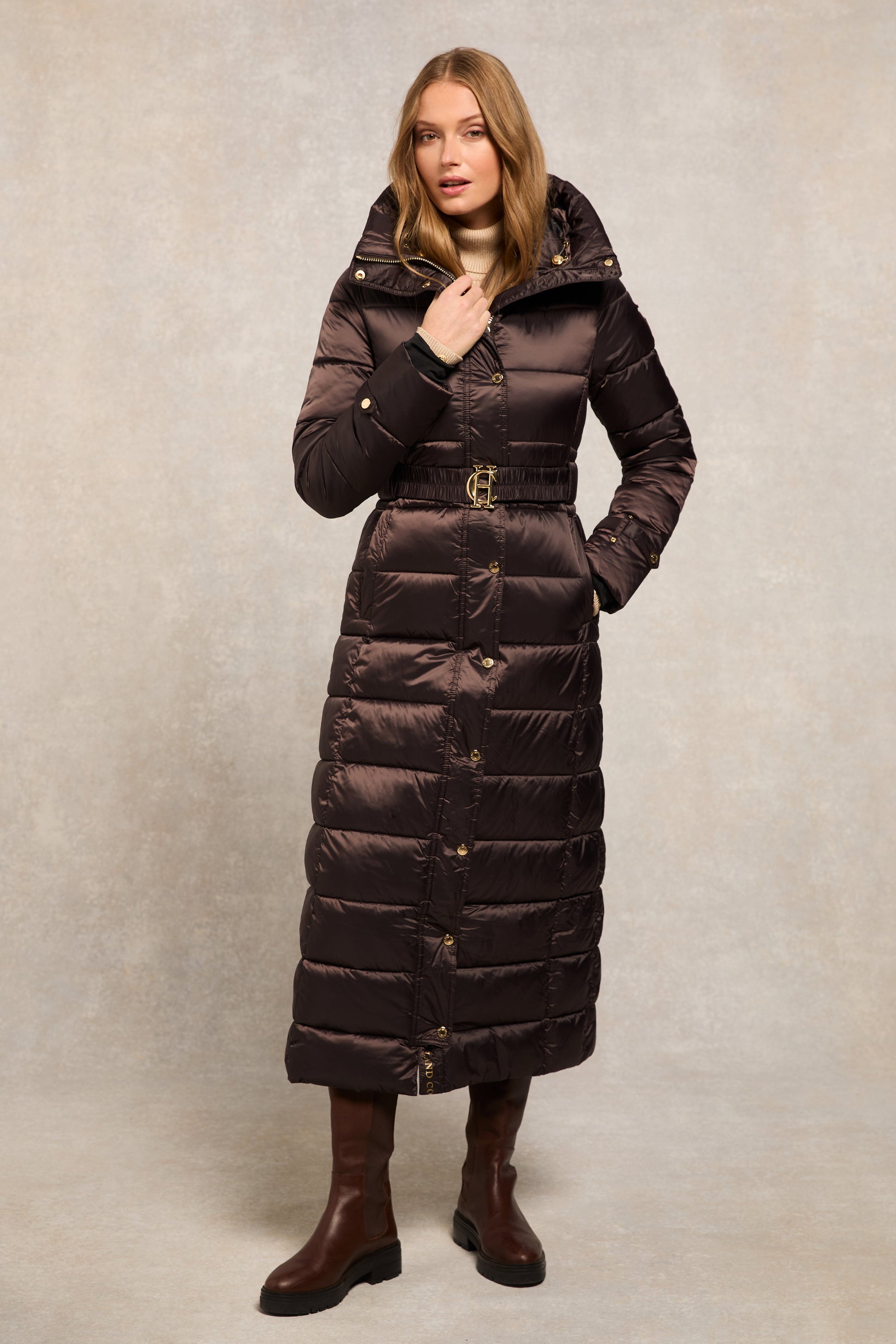 Providing a slimming silhouette with its integrated belt to cinch you in. this coat is an elegant and sophisticated alternative to your typical padded outerwear. Filled with a premium eco fill for ultimate warmth and decorated with gold metal hardware. Detailed with a jacquard branded belt with iconic HC gold buckle with a bold & oversized face-framing hood.