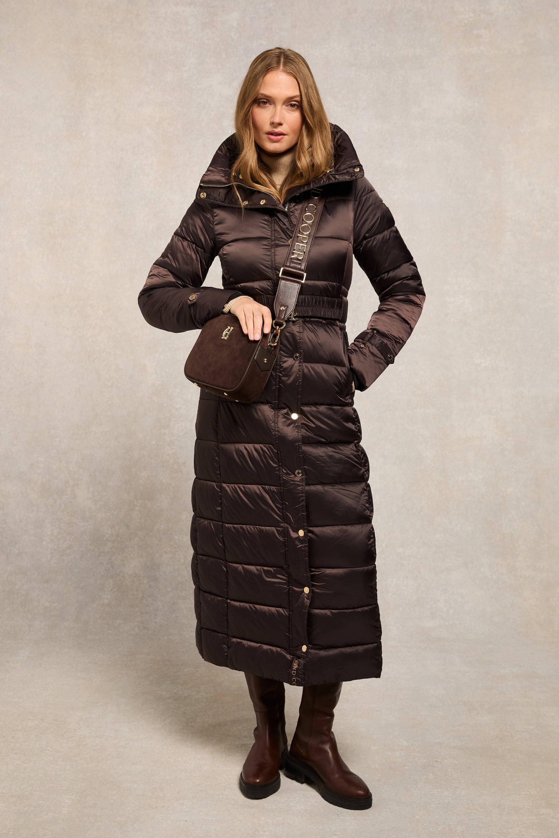 - Figure-flattering super longline padded jacket with integrated belt
