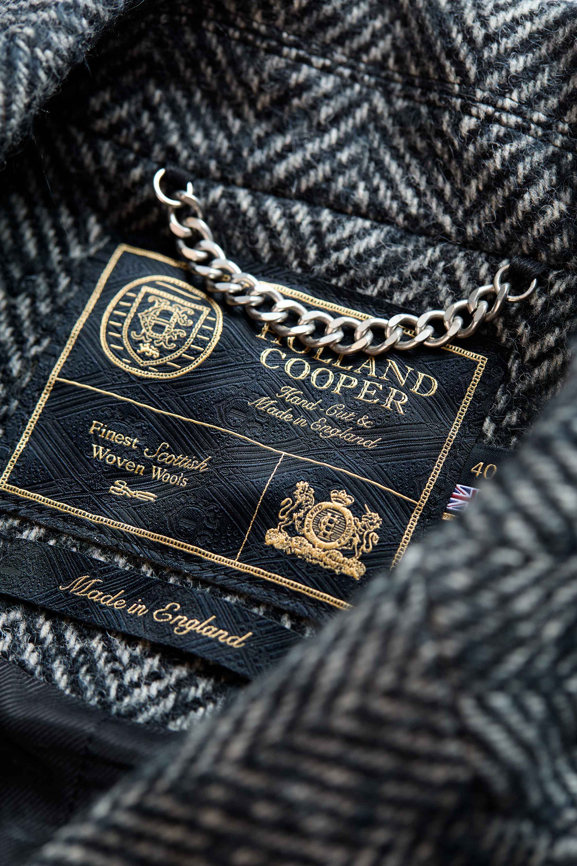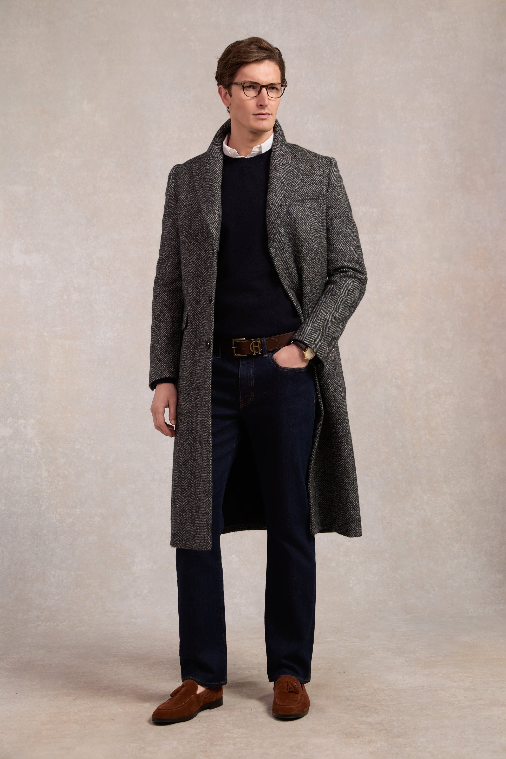 A refined take on classic tailoring. the Fairford Coat is crafted from pure wool herringbone. offering both warmth and timeless sophistication. The sleek. calf-length silhouette is elevated by peak lapels and a black leather collar stand. while a concealed button fastening ensures a clean. polished finish. Thoughtfully designed with a vented back for ease of movement. articulated sleeve openings with branded alloy buttons. and a fully lined interior with contrast leather-trimmed pockets. this coat is the perfect blend of heritage craftsmanship and modern elegance.