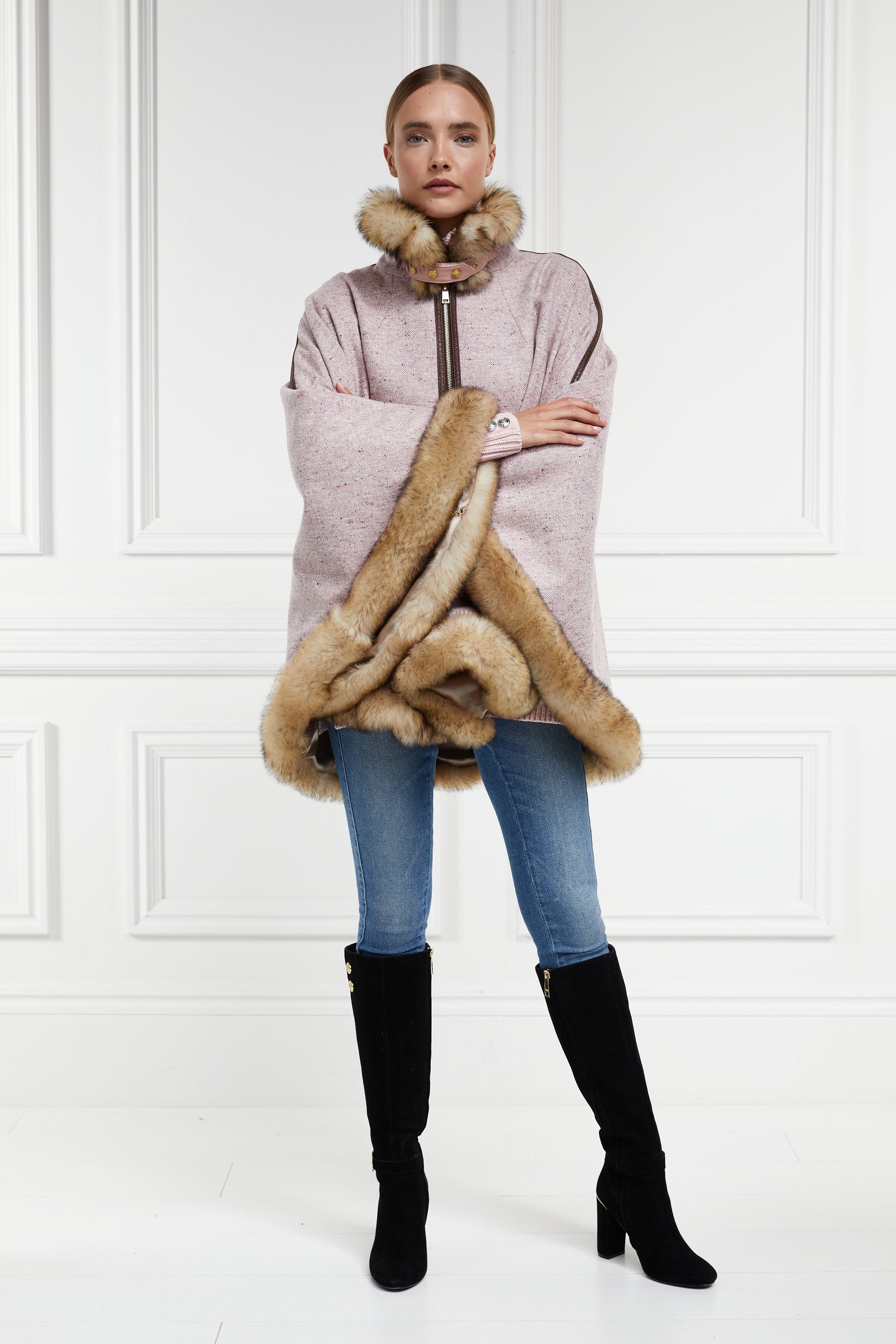 The Gold Label Chiltern Cape is a stunning homage to Holland Cooper's rich heritage. Meticulously designed with a relaxed fit silhouette. this cape is fully lined and is cut to scoop down at the back for a feminine look and feel. Trimmed fully with a luxurious faux fur look. made from the finest double finished Toscana lambswool.