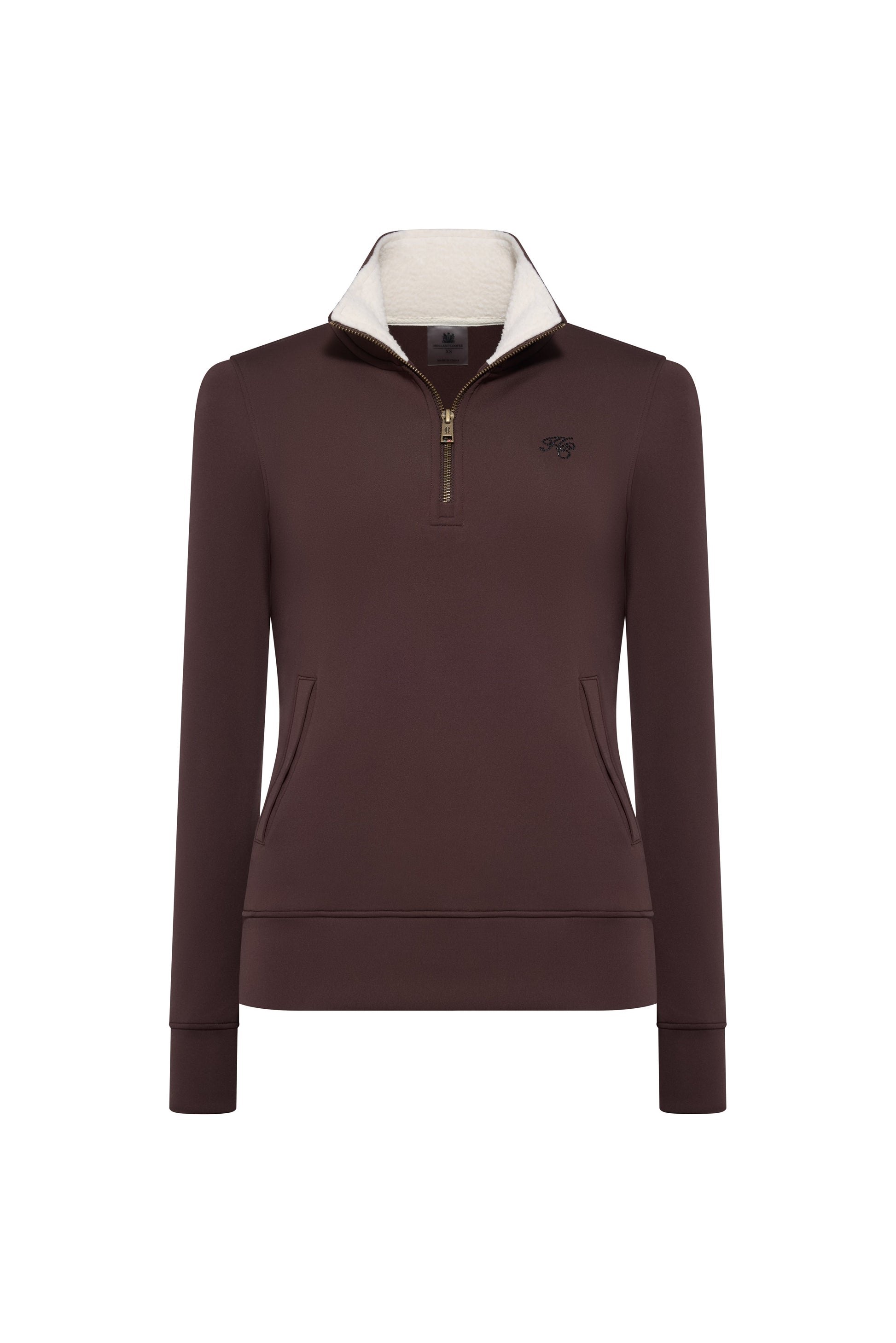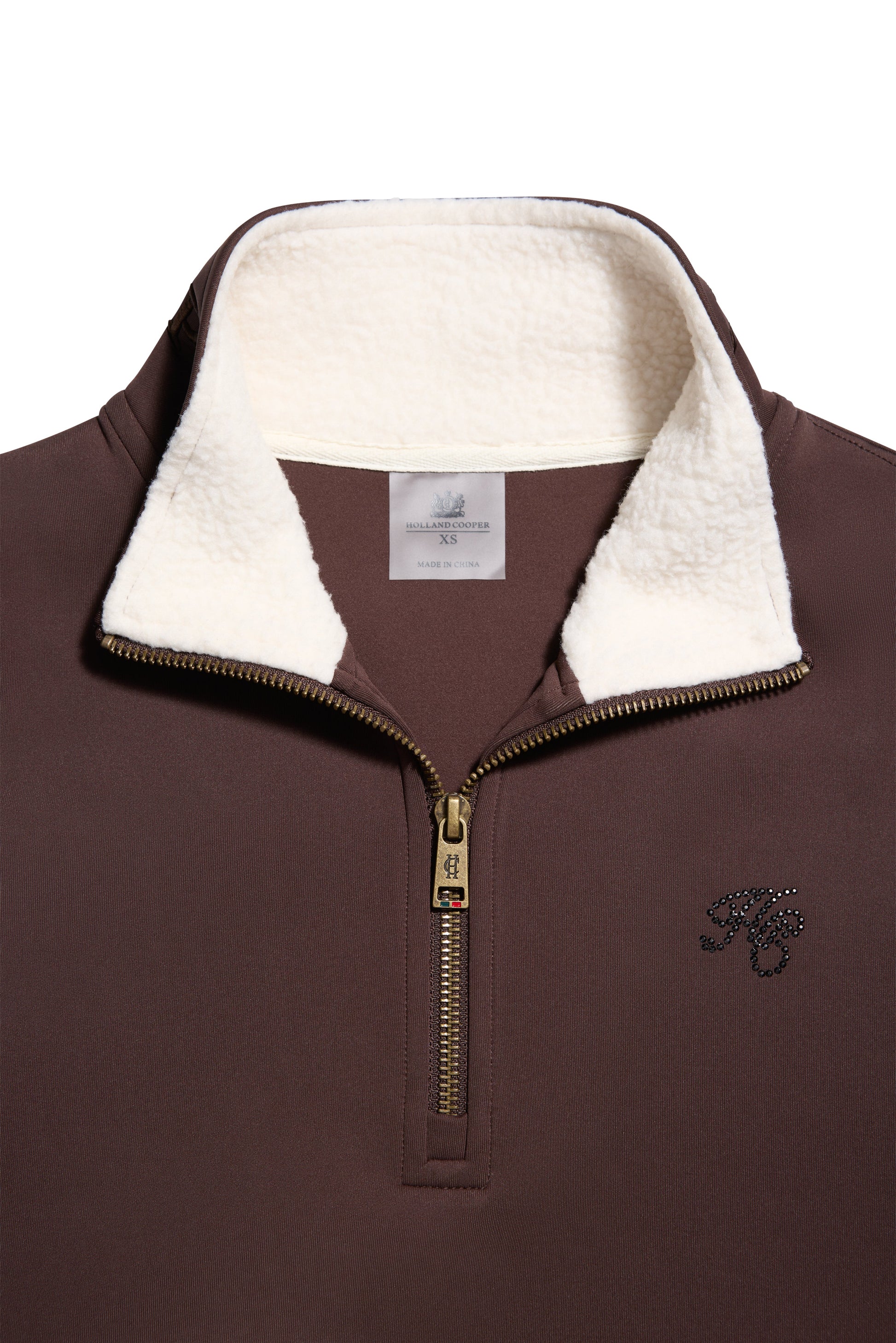 Crafted from smooth. soft-touch fabric. this piece is all about comfort. Designed for a relaxed fit with set-in sleeves. it offers ease of movement while maintaining style. The funnel neckline with sherpa on the inside provides extra warmth and coziness. Featuring a branded zip pull with a 1/4 zip opening. it's as practical as it is stylish. The high build embroidery with feature crystal branding on the chest adds a touch of elegance.