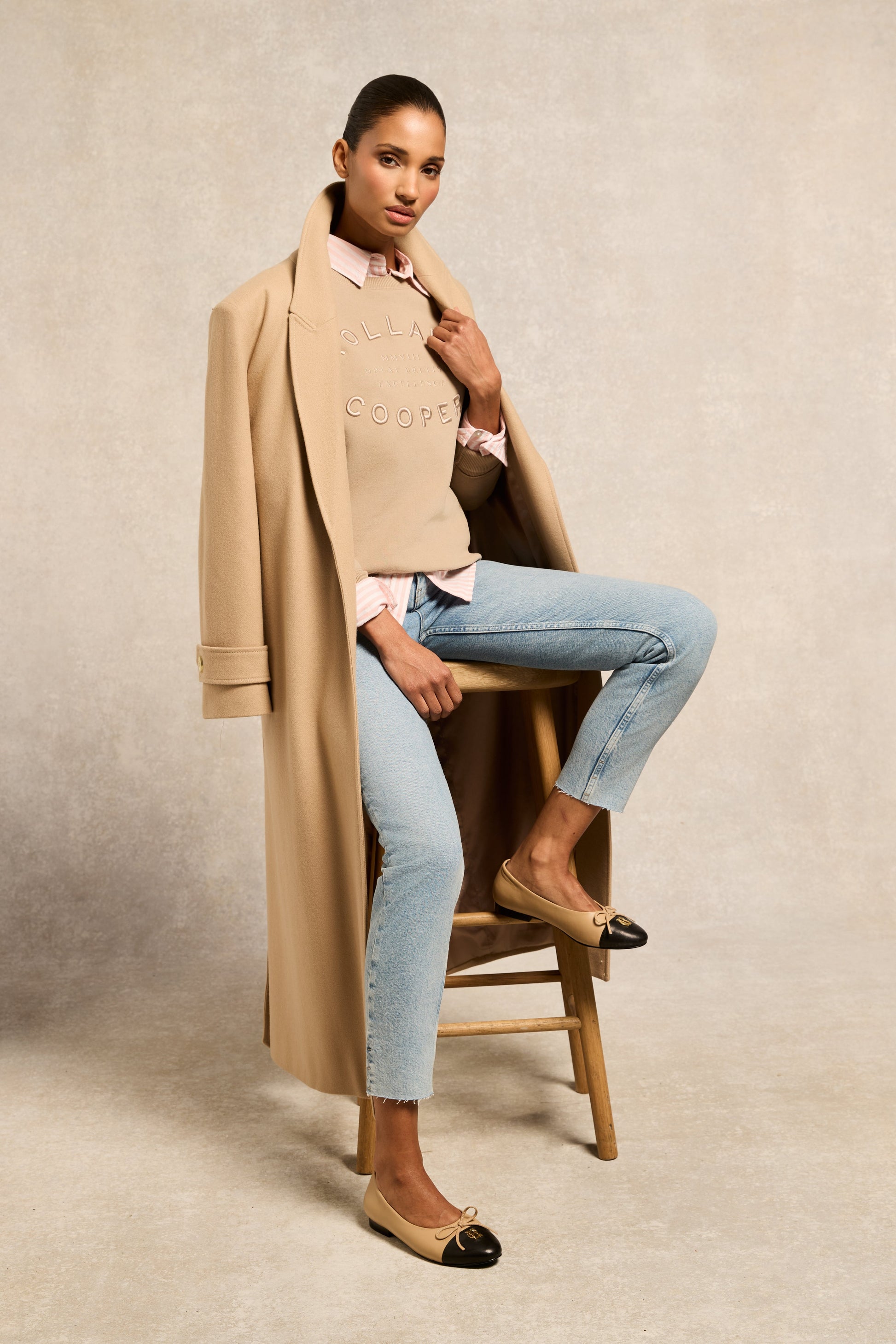 This refined essential offers exceptional comfort and enduring style. The slim-fitting silhouette creates a sleek. tailored appearance. while set-in sleeves ensure a clean. sophisticated line. Detailed with our distinctive high-build embroidery and finished with luxurious ribbed texturing at the neckline and cuffs. this piece epitomises understated elegance.