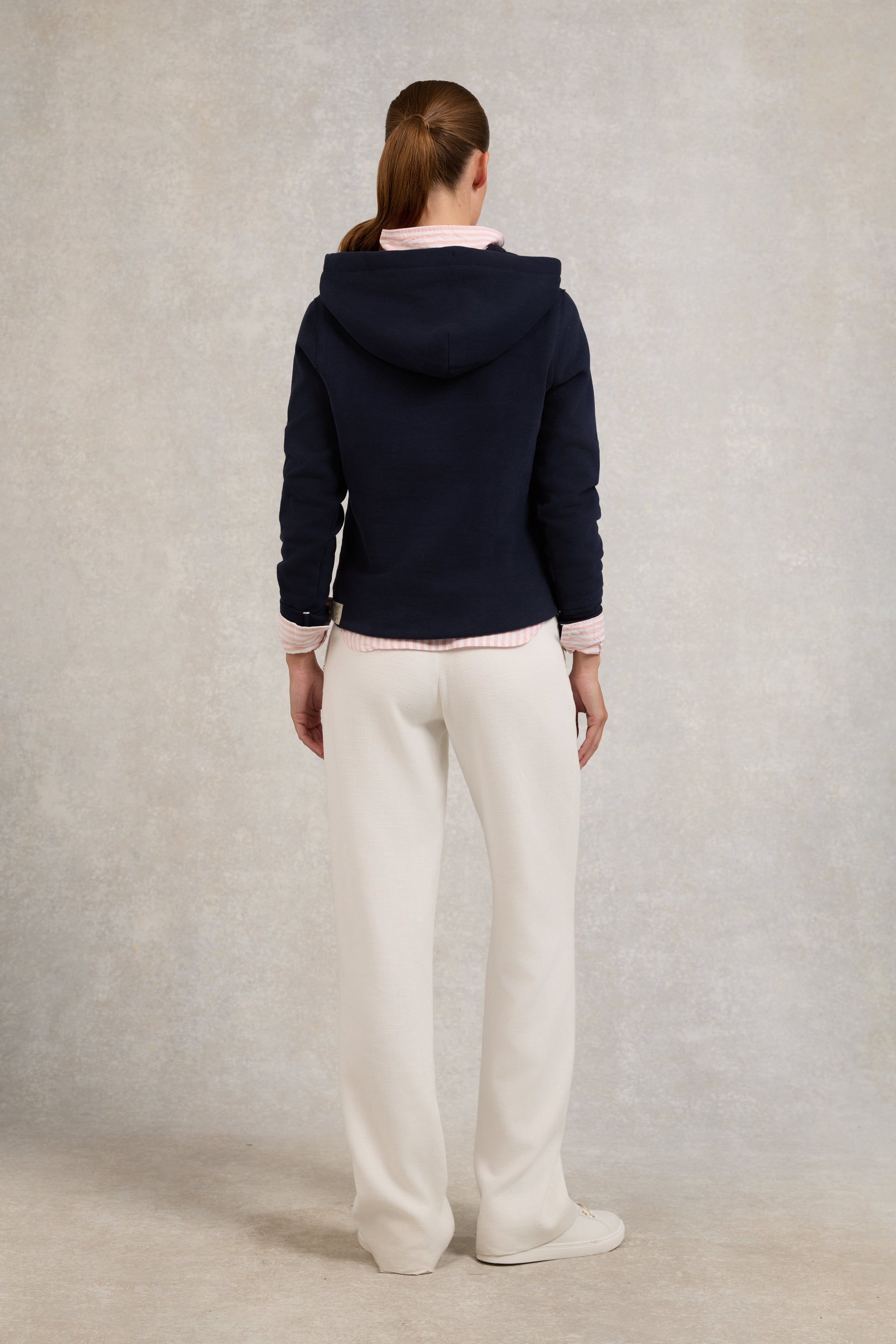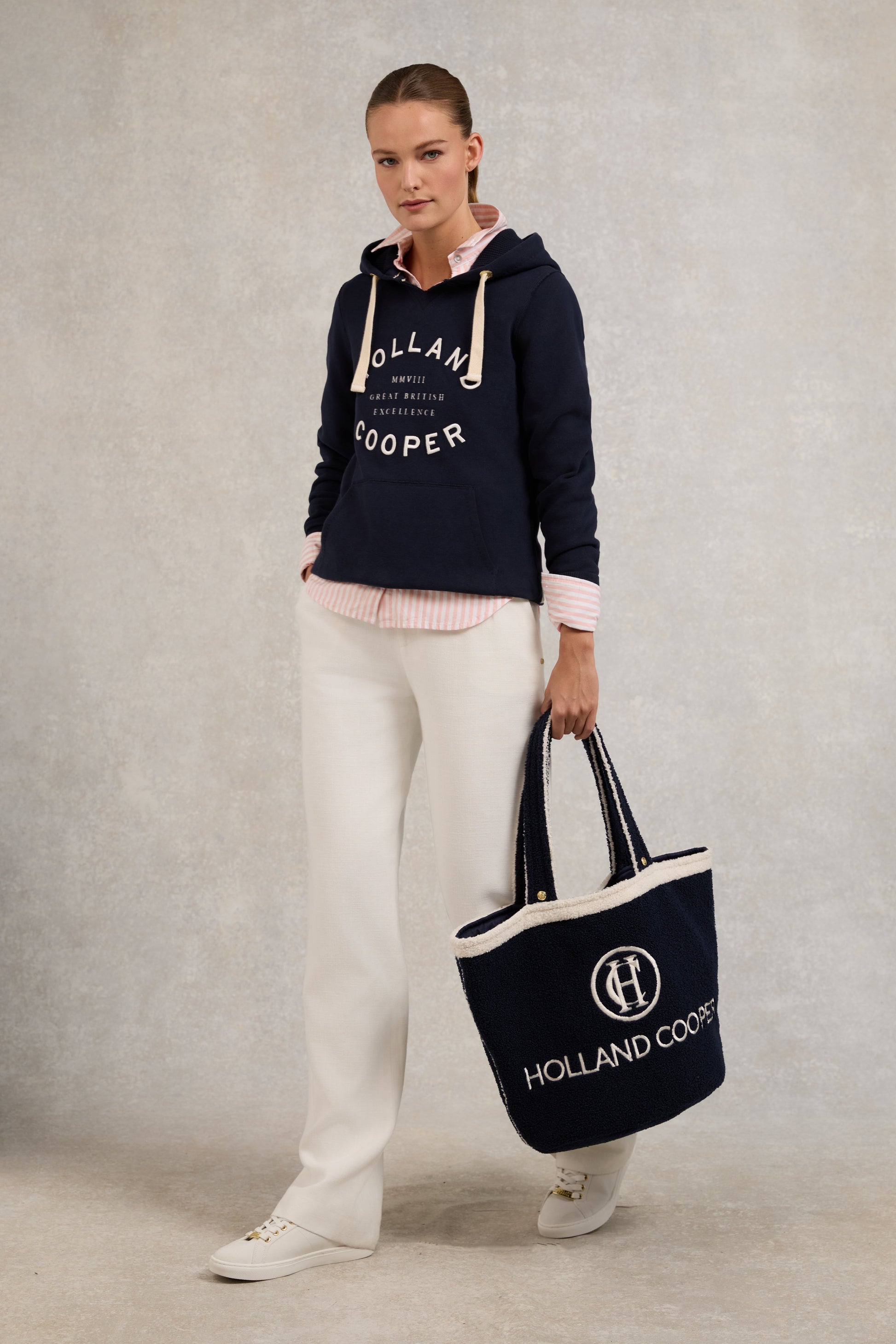 Made from a soft cotton mix jersey. this hoodie has been cut for a relaxed fit with a handy kangaroo pocket and drawstring hood. With a ribbed hem and cuffs with high build embroidery on the chest. Elevated with our iconic gold hardware.