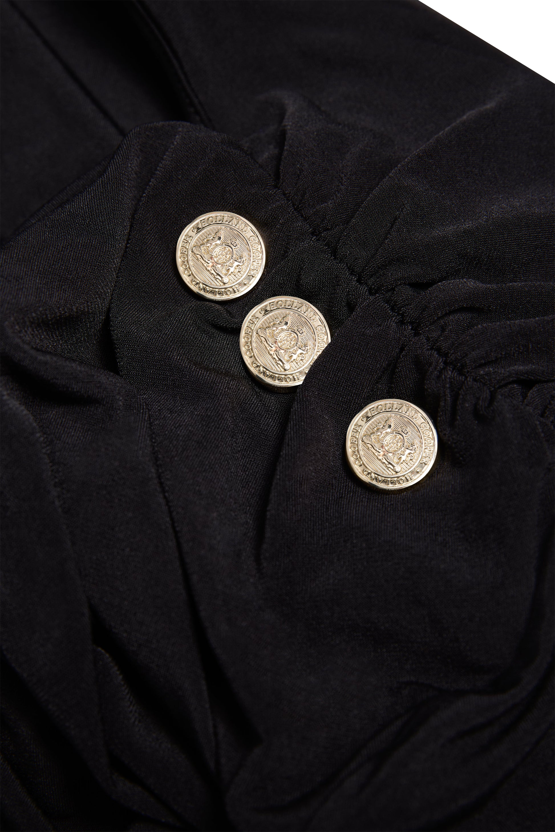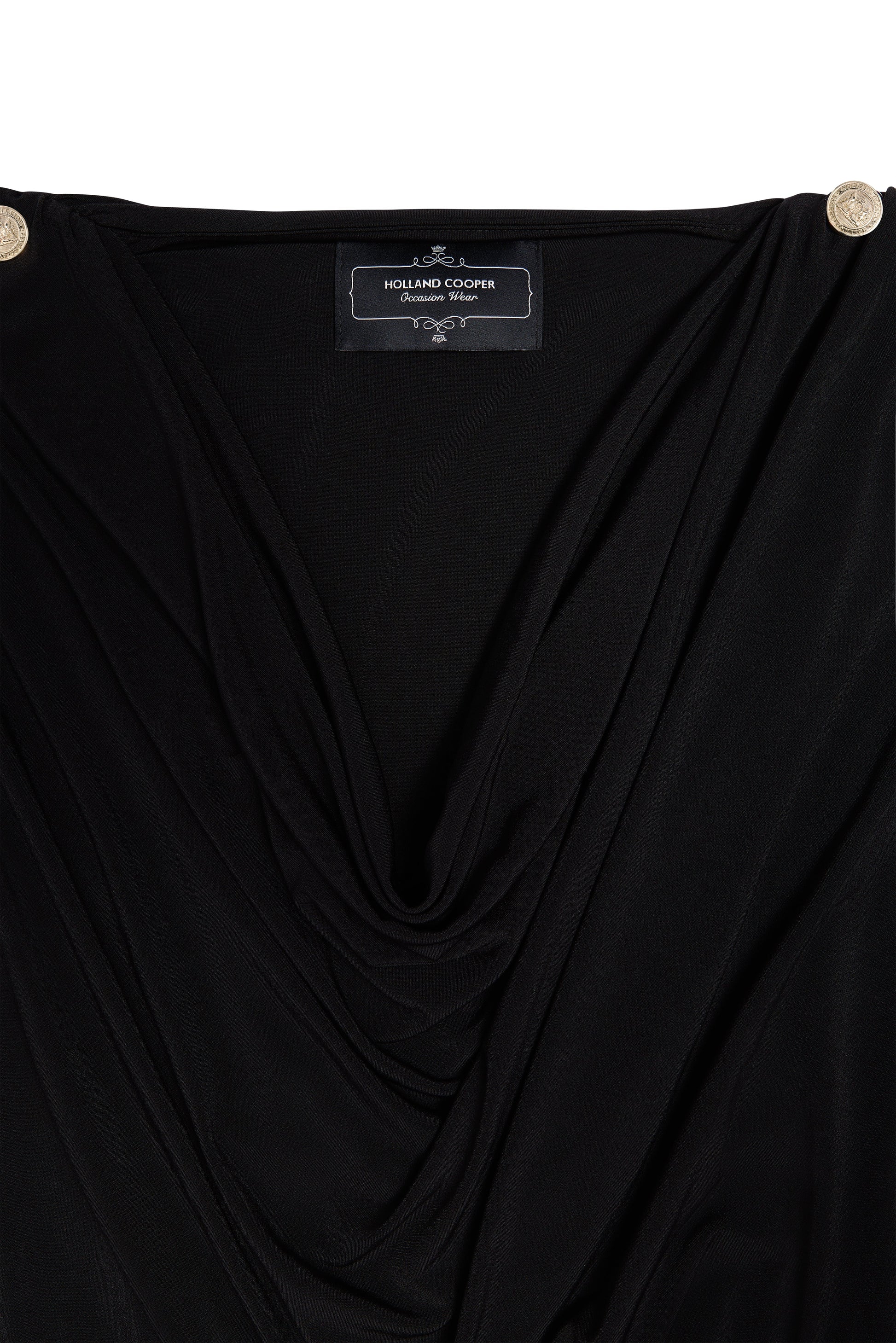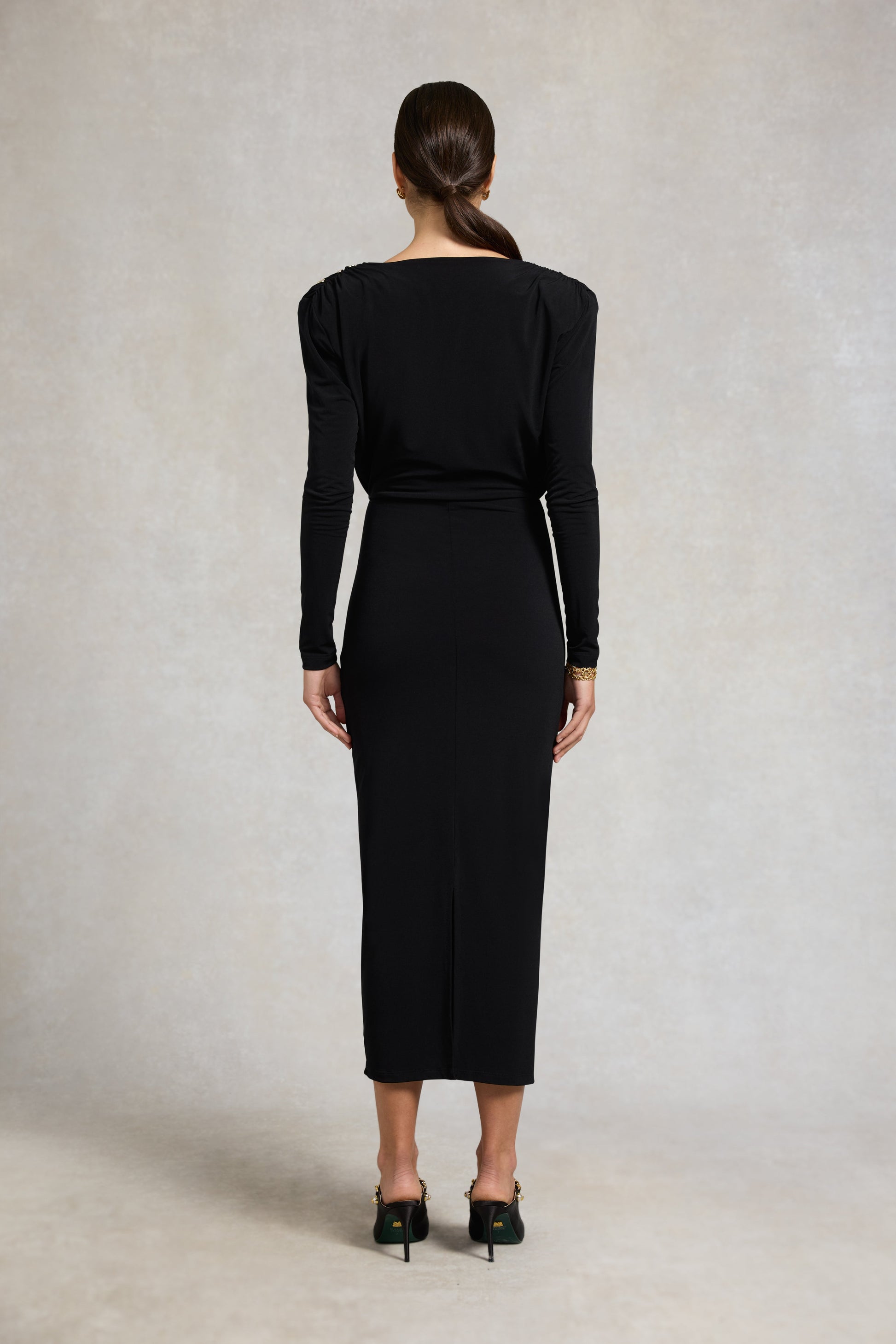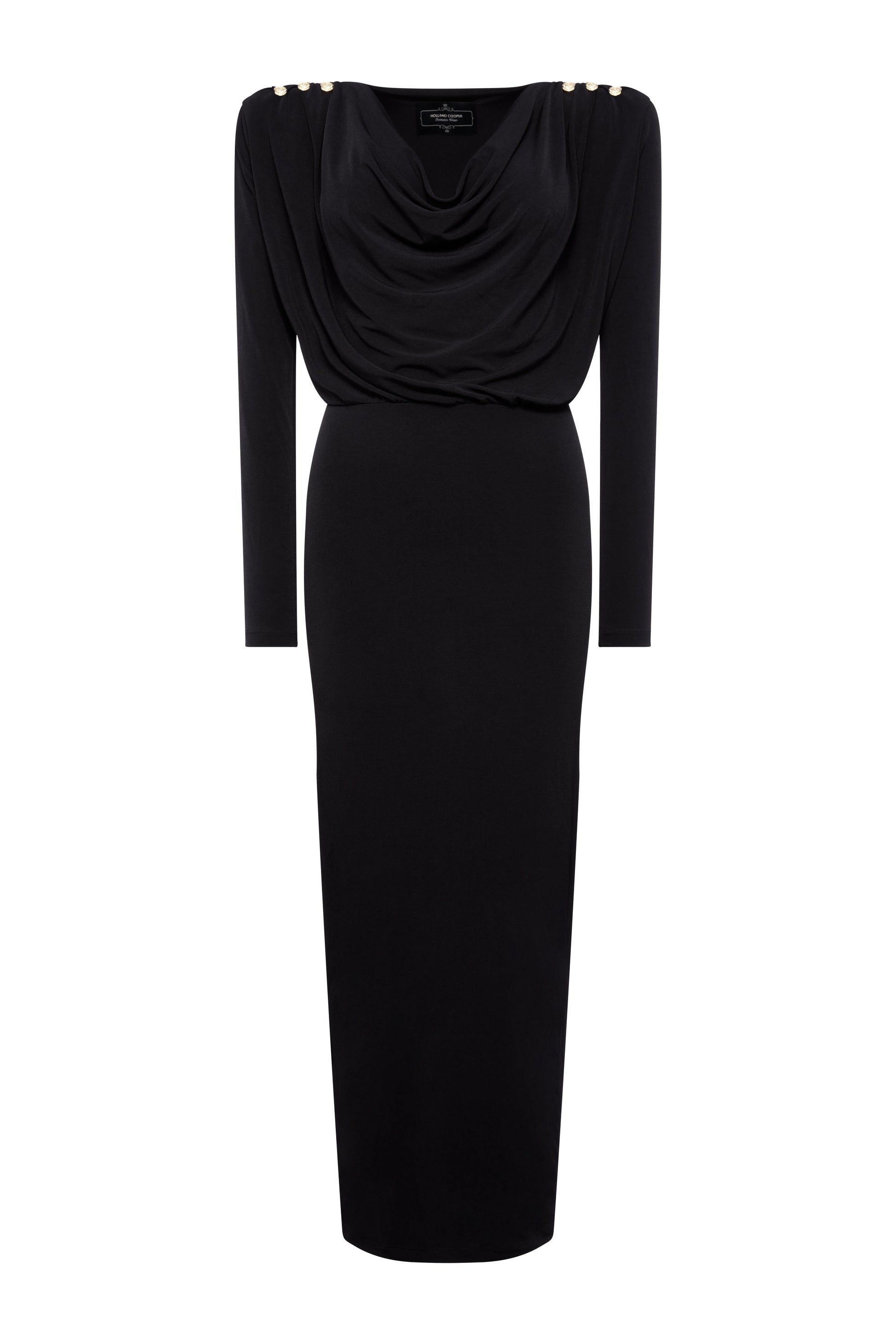 The Verity Dress is a sleek. contemporary silhouette designed to flatter and elongate. Crafted from slinky jersey. it features a low cowl neck. slim sleeves. and a waist seam that enhances the figure. Rivet detailing on the shoulders adds a subtle edge. with detachable shoulder pads for optional structure. The slim maxi skirt flows elegantly for a refined. modern finish. making this dress perfect for evening occasions or sophisticated daywear.