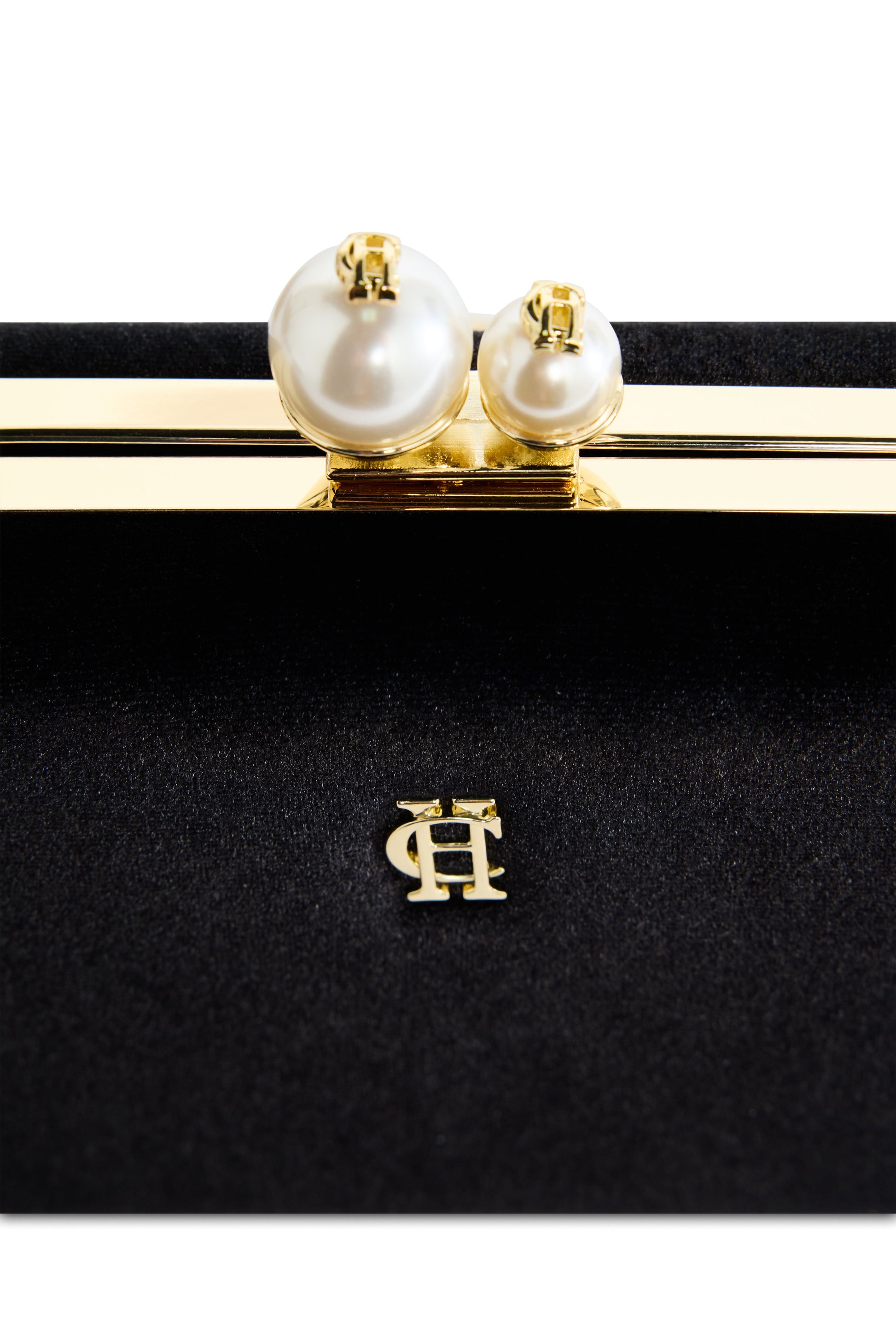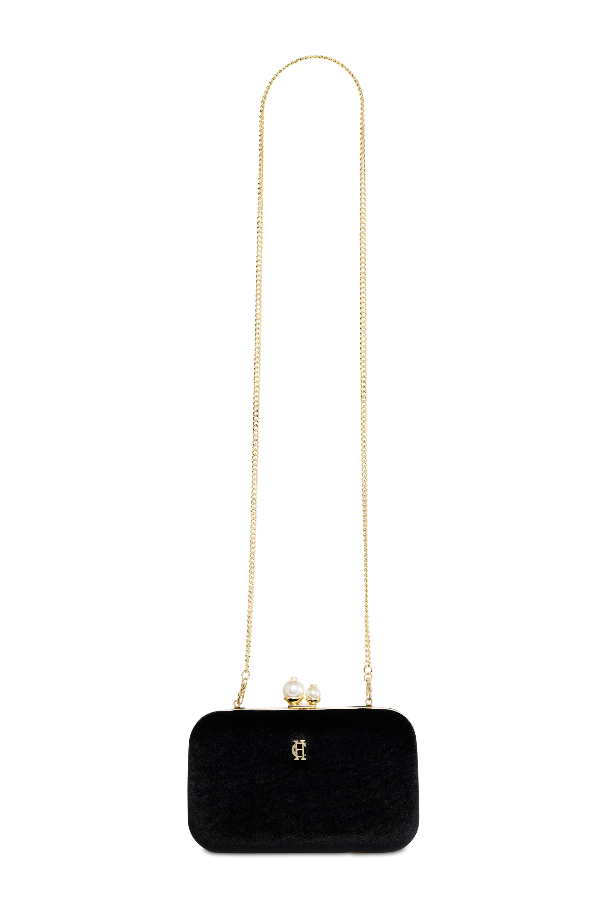 A statement accessory for special occasions. the Vienna Evening Bag is crafted in luxurious black velvet with a structured hard case and elegant gold frame. The pearl closure with hinged design adds a timeless. refined touch. while collapsible D-rings allow it to be worn as a clutch or crossbody for versatile styling. Fully satin-lined and finished with a gold HC pin. this bag combines sophistication with practicality for unforgettable evening looks.