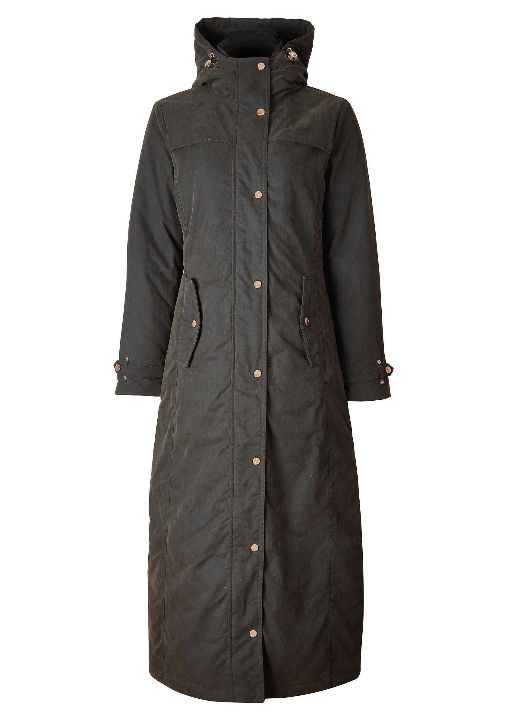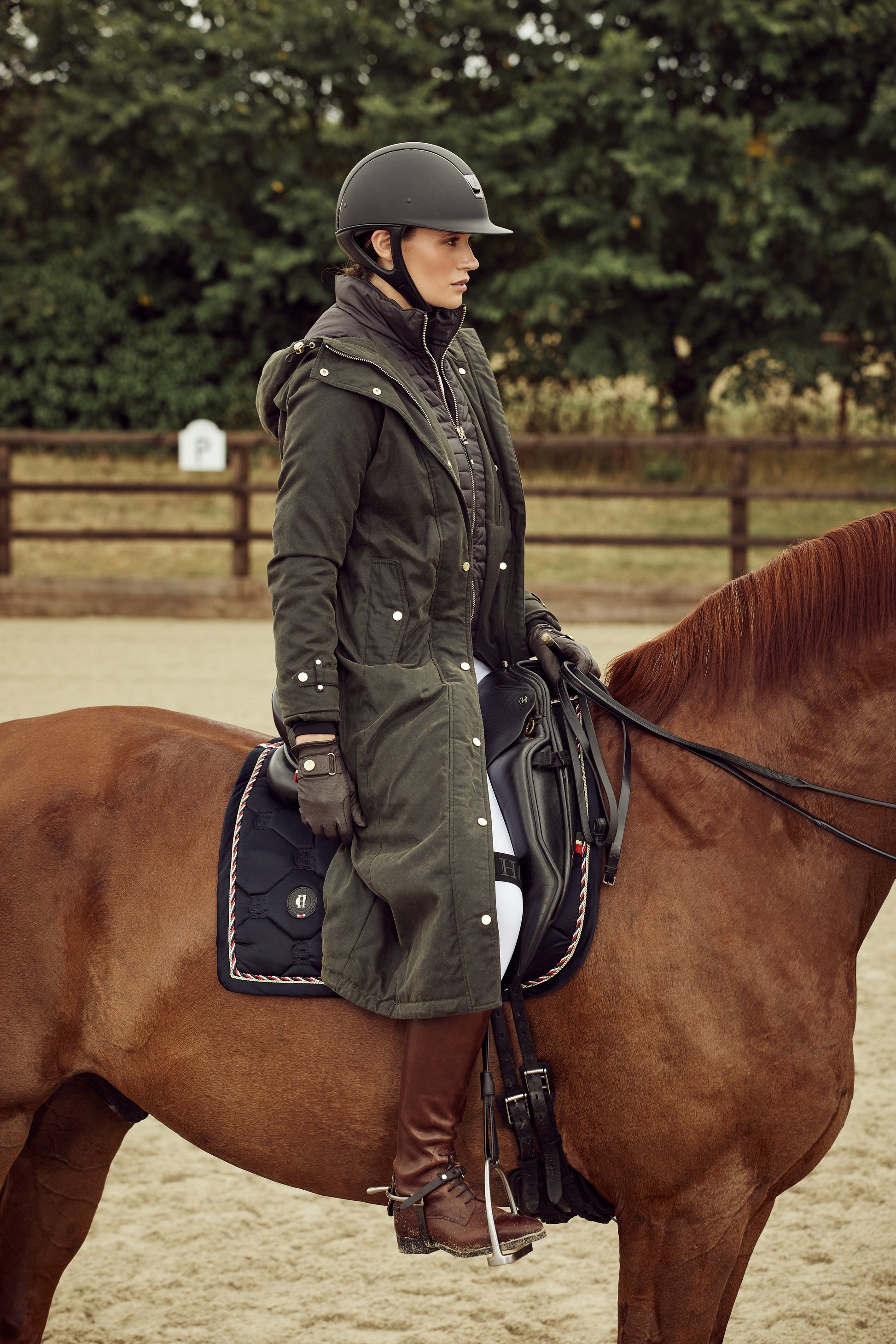 Perfect for those winter days. our Wax Longline Field Coat has been designed with a longline fit and wax coated. water resistant fabric. With internal gilet for an added layer of warmth and interior leg straps for riding. this coat is ideal for wearing both casually or whilst in the saddle. For the ultimate touch of luxury. this coat has been detailed with tonal embroidery. gold hardware and princess seams for a flattering silhouette.