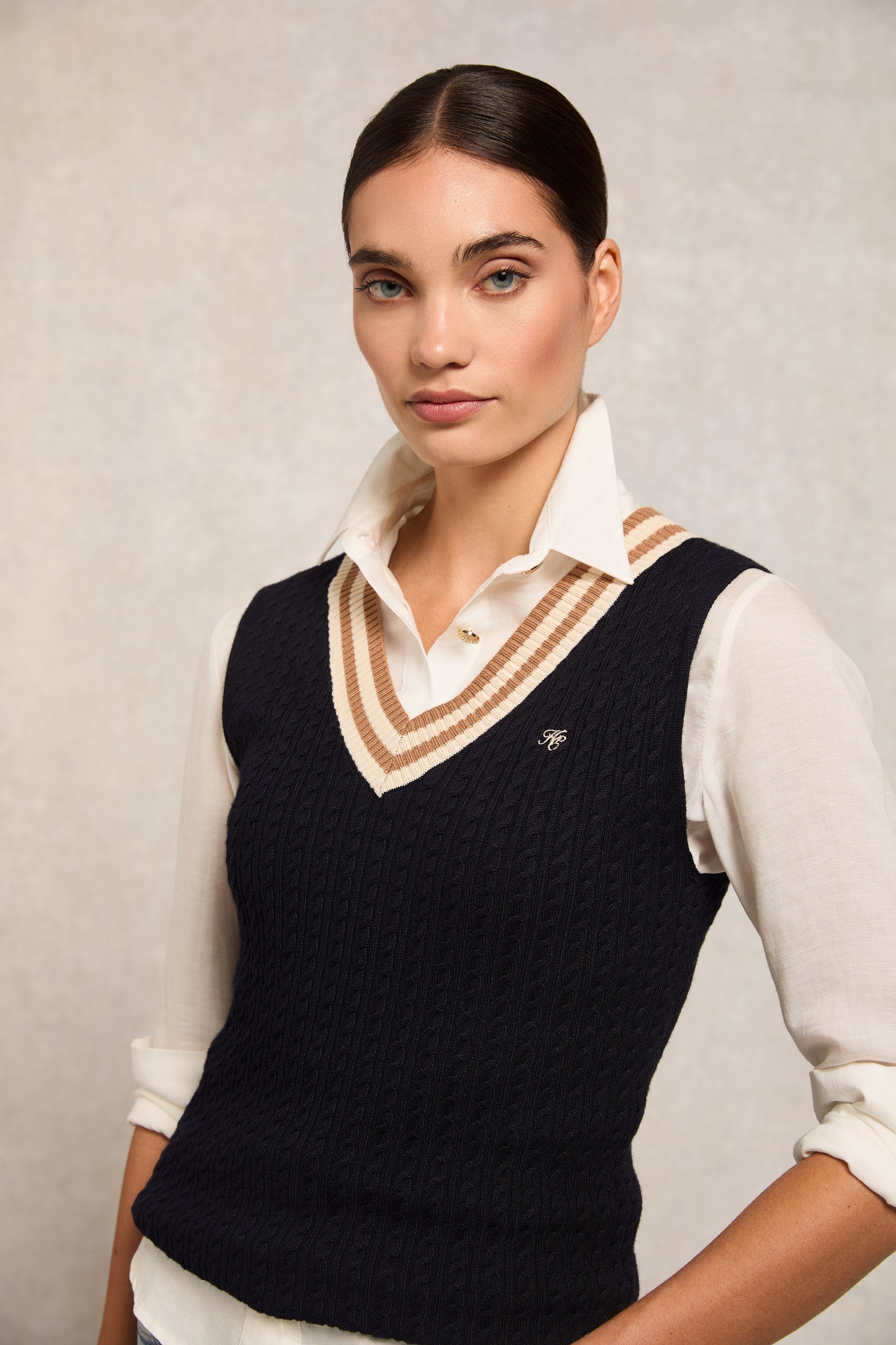 Crafted from a luxurious blend. this top offers a smooth. flattering fit that contours gracefully to the body. The design features a sophisticated play of textures with contrast rib stripes and intricate cabling throughout the body. adding a touch of classic charm. This slim-fit tank is an impeccable choice for both casual and elevated ensembles. promising versatility and style.